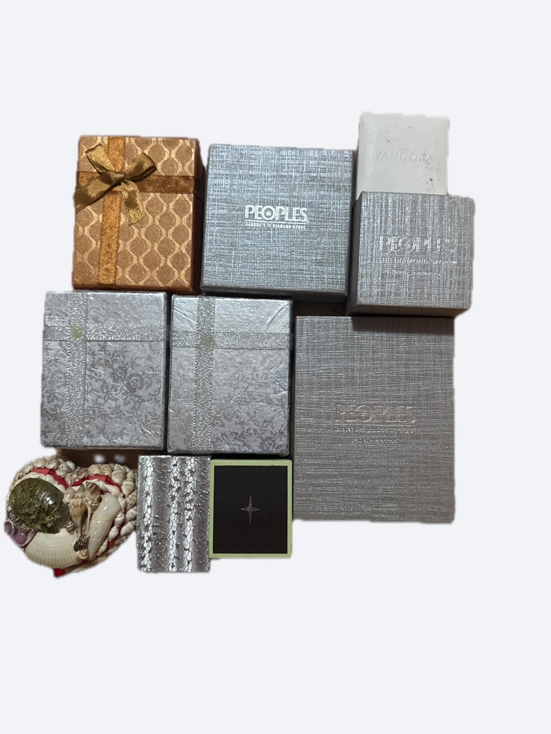 114Collection of various empty jewellery boxes. Includes Pandora, Peoples, and Ross-Simons boxes. Different sizes and styles. Perfect for storing your own jewellery or for crafting projects.