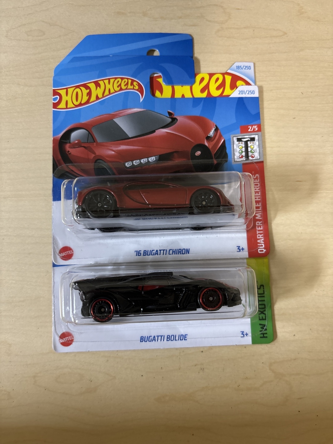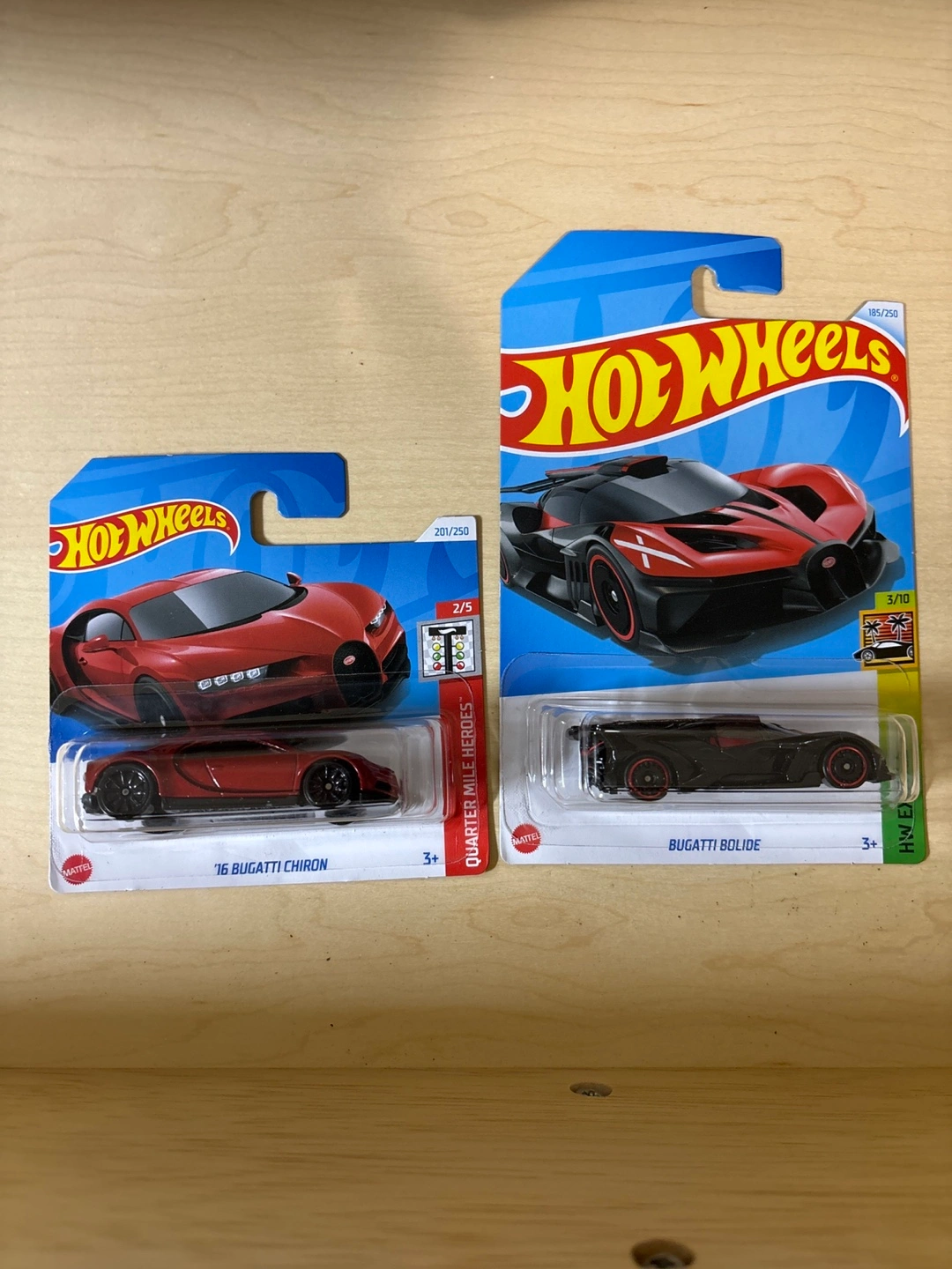 Two Hot Wheels cars. '16 Bugatti Chiron in red and Bugatti Bolide in red & black . Quarter Mile Heroes and HW Exotics series. New in package.