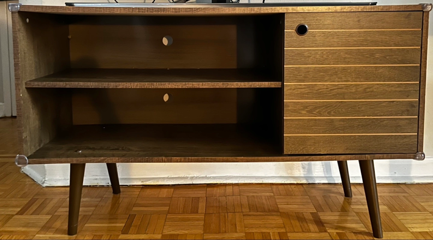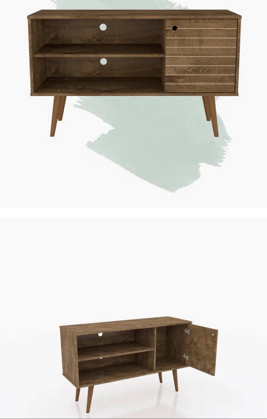 Rustic brown TV stand with two shelves and media holes for cable management and concealed storage space.