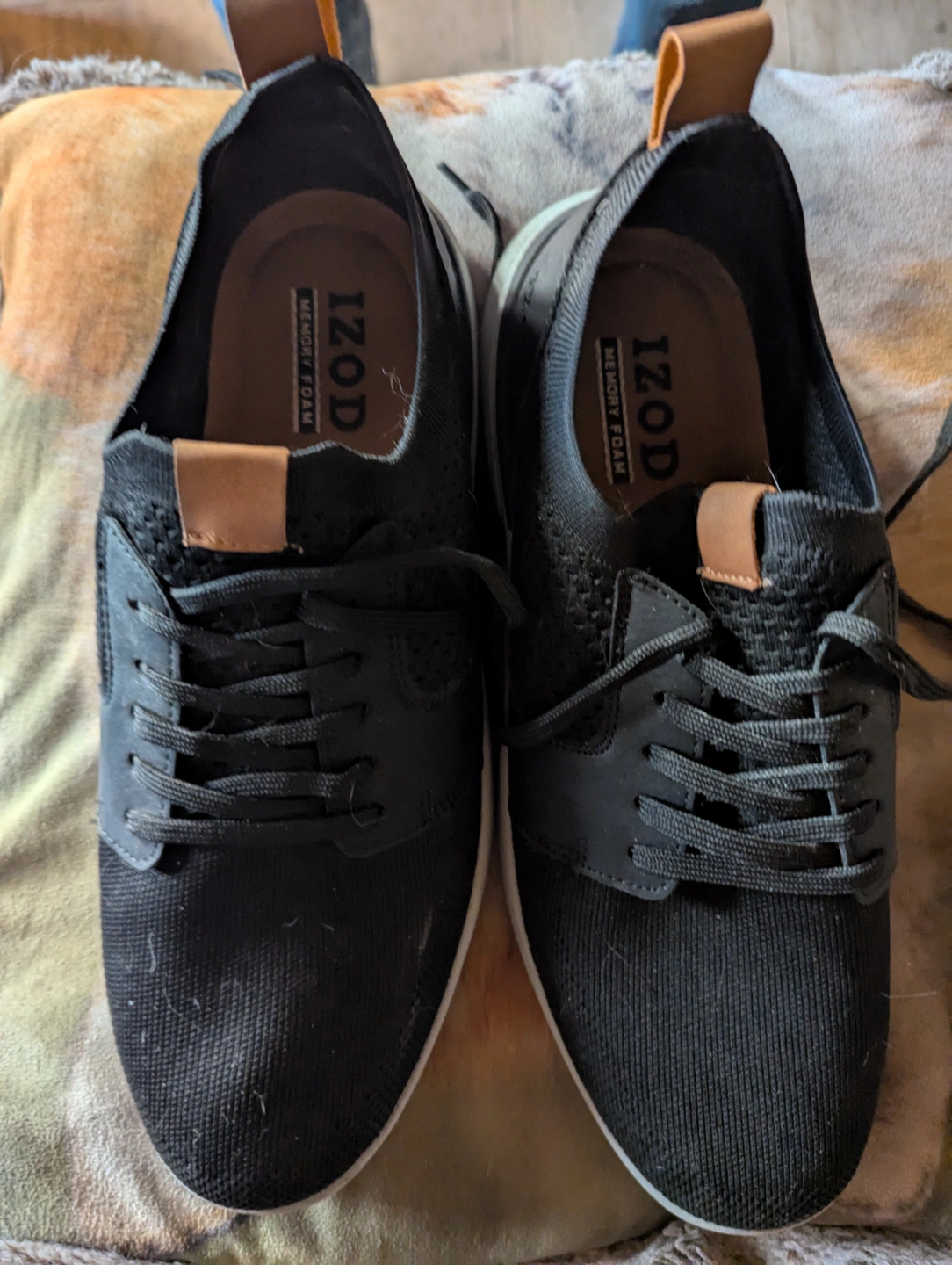 783Men's casual sneakers. Black knit upper, white sole. Memory foam insoles. Lace-up closure. Tan leather accents.
