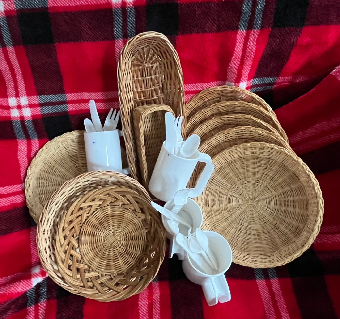 Adorable 10 pieces wicker picnic basket set. Includes various sized plates and bowls. Four white plastic mugs & cutlery. Waiting for your outdoor adventure!