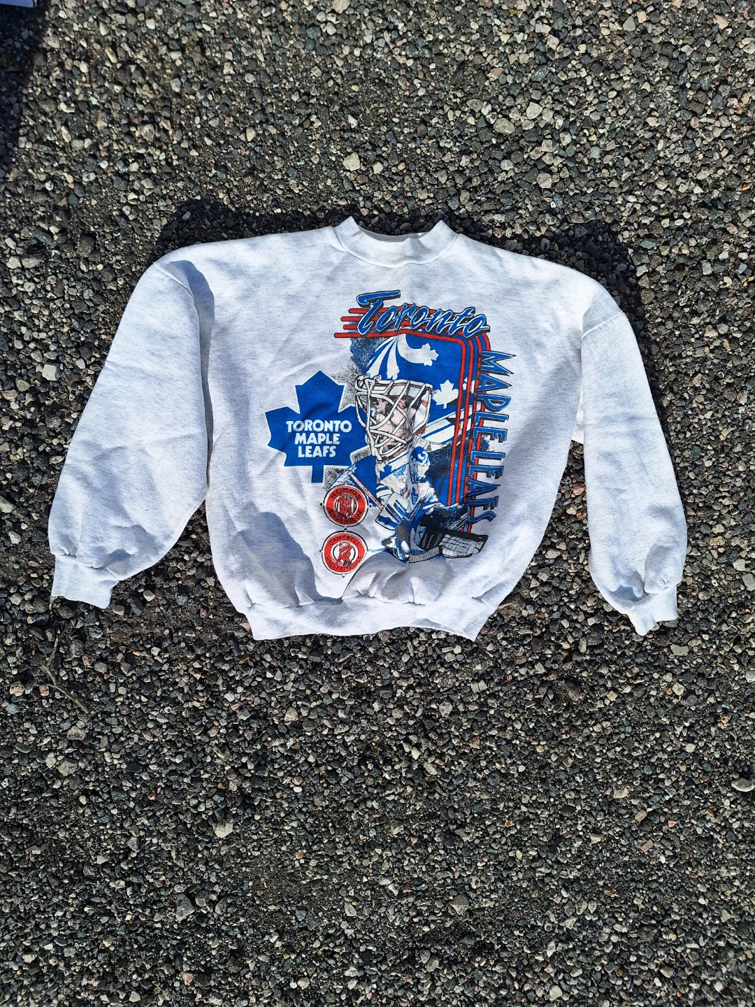 50% polyester, 50% cotton. Kid's Medium. Made in Canada. Features a graphic design of a Toronto Maple Leafs player. Crew neck. Long sleeves.
