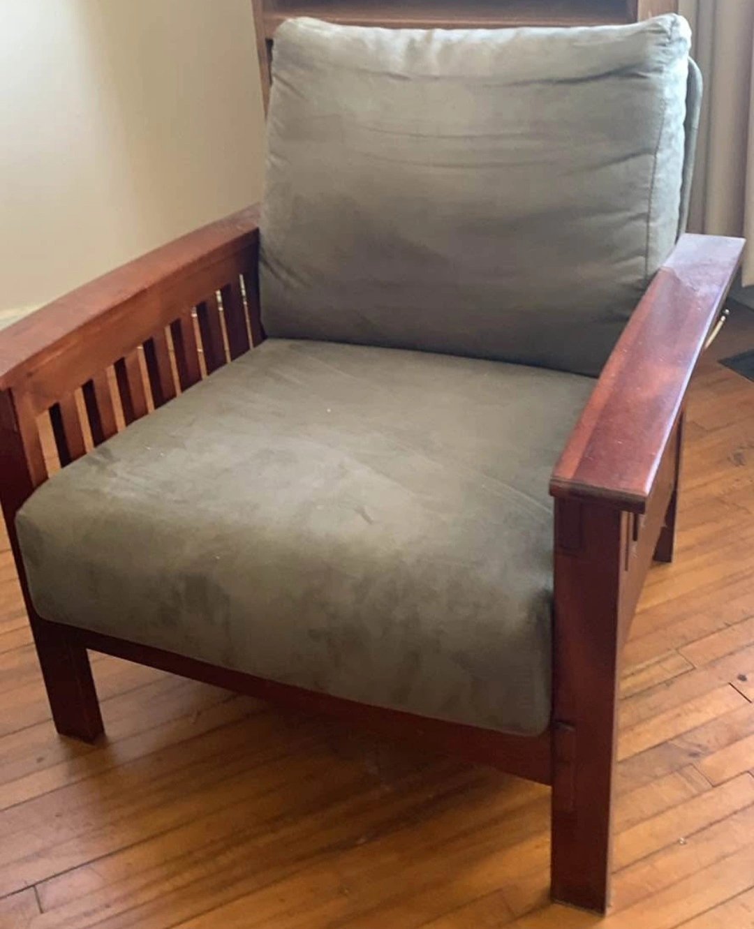 125This cozy armchair features a sturdy wooden frame and comfortable, olive green cushions, perfect for adding a touch of rustic charm to any room. This armchair has been used but absolutely stunning solid condition. you can try before you pay. Will fit in regular size SUV. Cushions are washable and with no wears. * Solid wood frame * Olive green cushions * Comfortable seating If the ad's still up, the armchair's still available – ready to be whisked away to its new home! Act fast before someone else snatches up this comfy find!