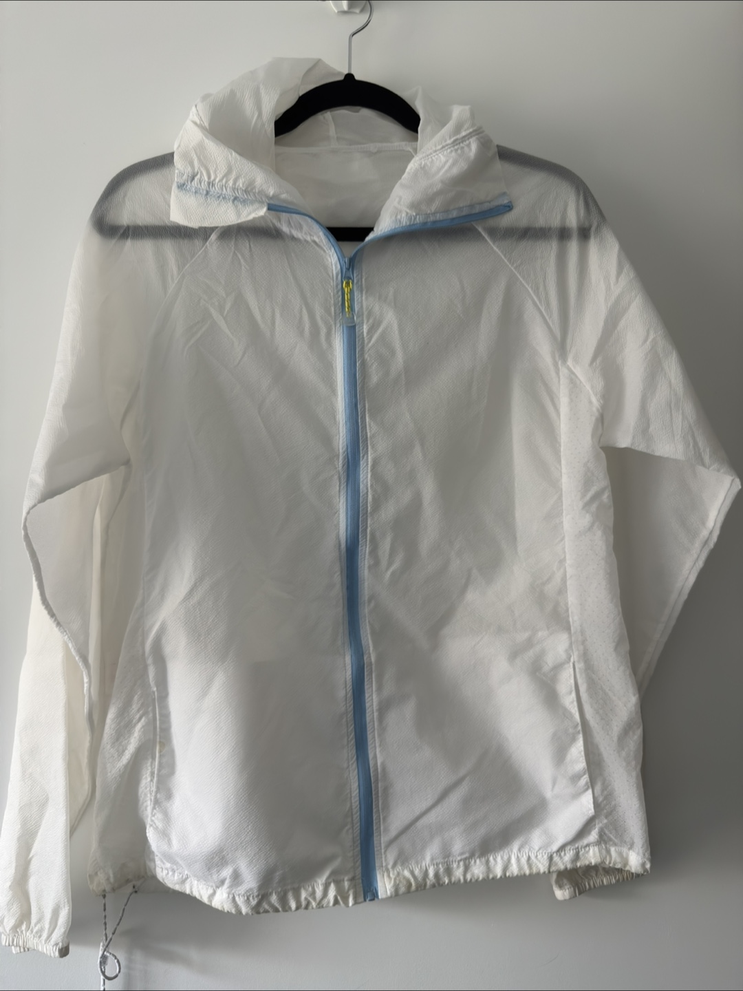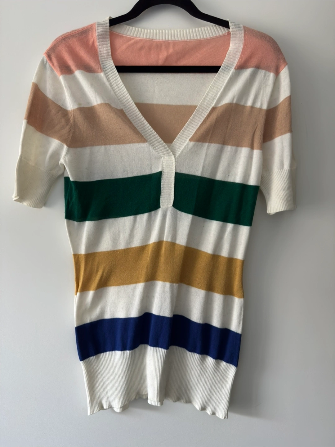 Bundle includes a white lightweight hooded jacket with light blue zipper and a short-sleeved v-neck pastel striped knit top. Both items are women's clothing. Maybe good for Size 6.