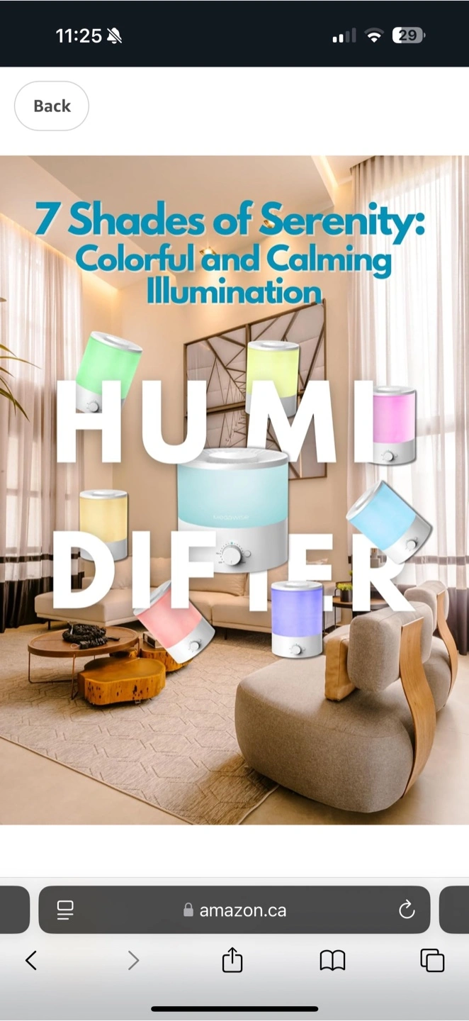 Ultrasonic humidifier. Adjustable mist output. 25dB quiet operation. 10 hours of continuous use. Easy to clean. 7 colour changing lights. Rotatable nozzle.