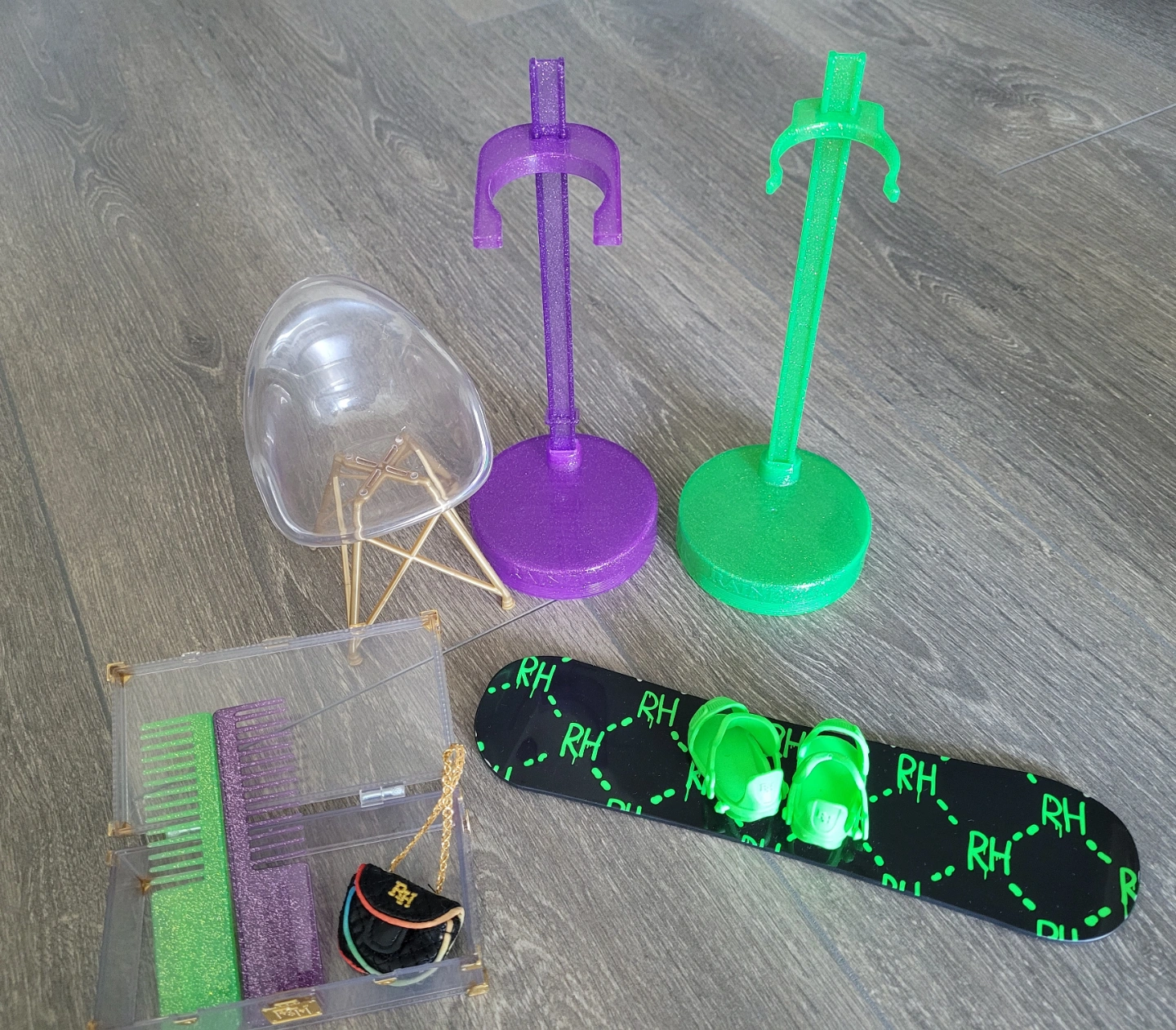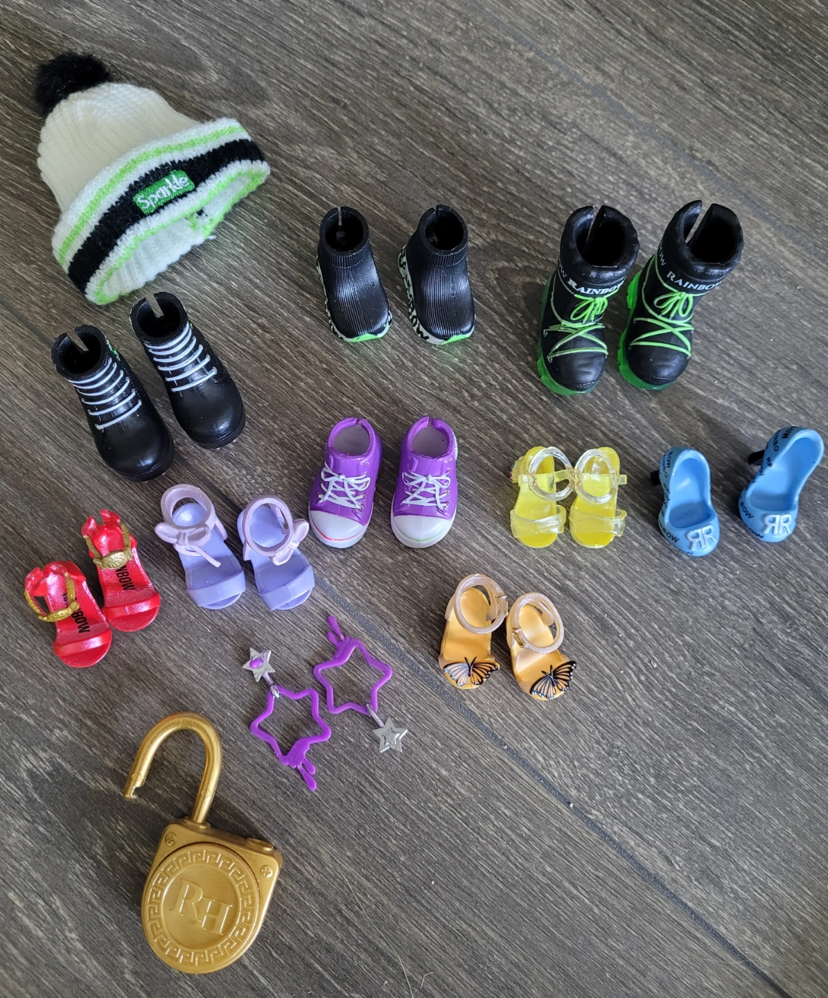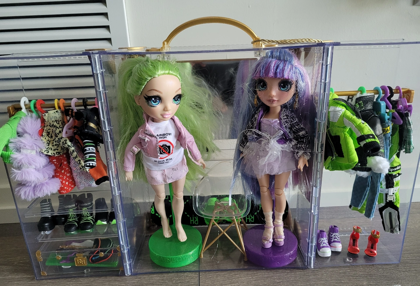 Two Rainbow High fashion dolls, one with lime green hair and one with purple hair. Includes a large clear plastic wardrobe with gold accents, multiple outfits, shoes, accessories, and doll stands. Many clothing items feature the Rainbow High brand.