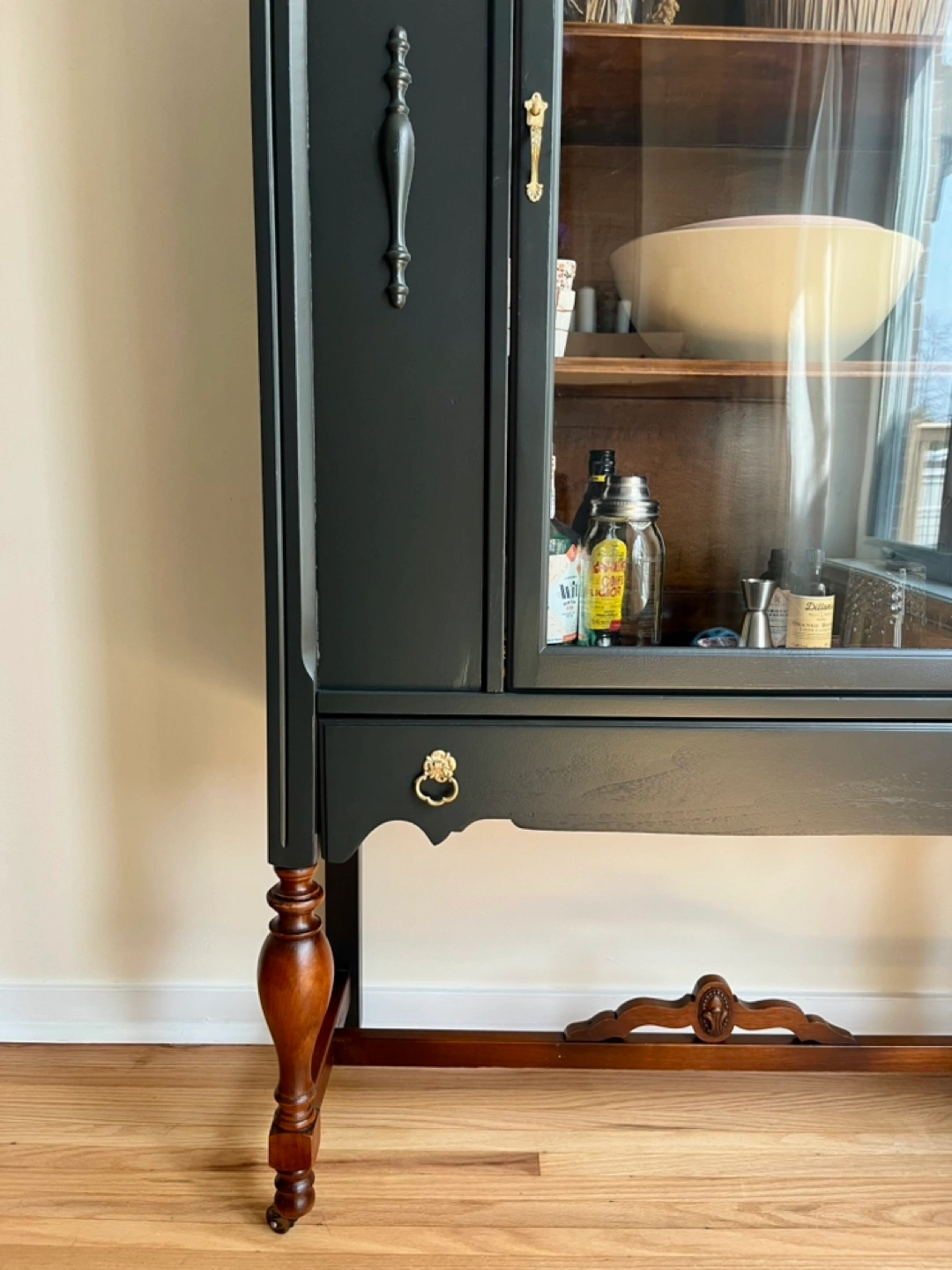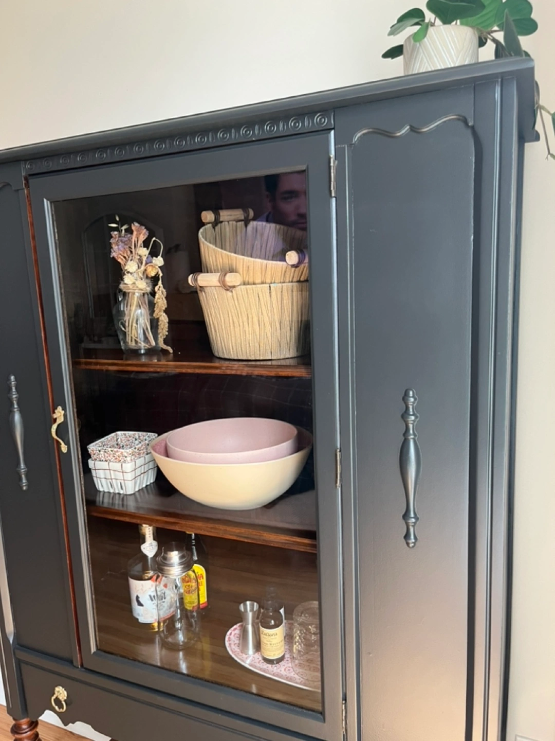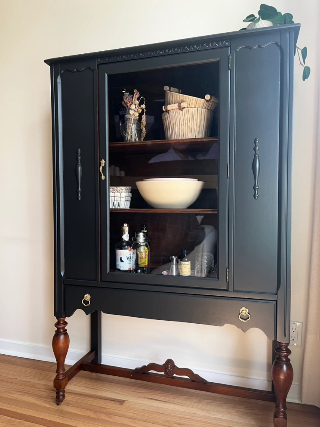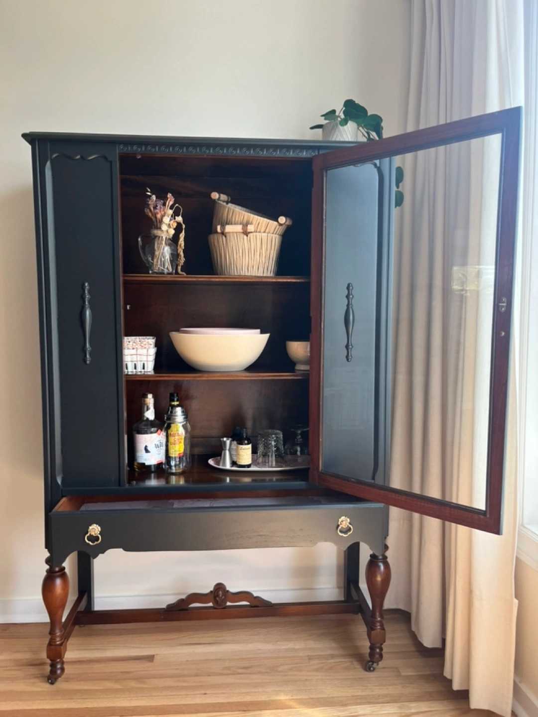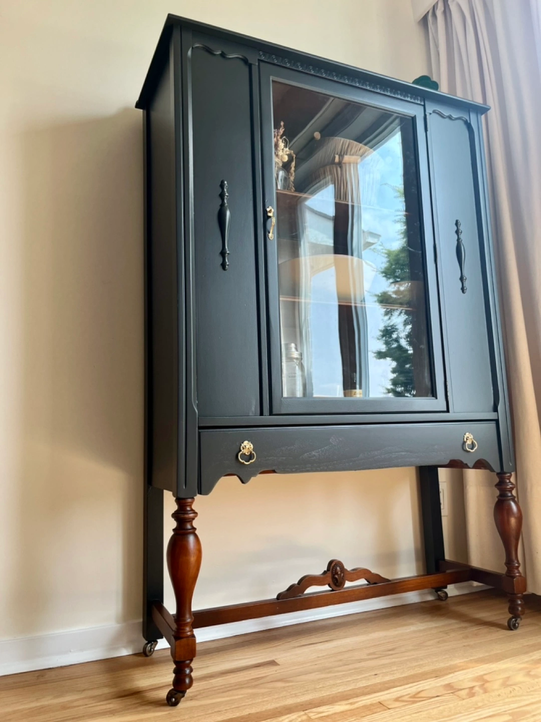 133✨Newly refinished with dove tail drawer✨ This piece is a mix of old and new in the best way! The vintage drawer pulls and wheels perfectly complement the modern mat black and clean glass door. This cabinet contains exposed and concealed storage space. Glass door handle has a latch that keeps the cabinet closed. There are multiple uses for this piece. Would go great in any dining or living area! Can be used more traditionally to house special dishes or can house decor, books, blankets or even as a liquor cabinet 🍸 It’s like open storage without all the dust accumulation! Dimensions H 59” W 37” D “14 Top shelf height 12” Middle shelf height 10” Bottom shelf height 11.5” The hardware is all original and cleaned to bring back to life in their antique gold colouring. The wheels are also original and have been scrubbed clean so they roll better. The beautifully shaped furniture legs have been restained in the original mahogany colour. Piece was completely cleaned. Body was primed and spray painted in a gorgeous furniture paint colour called Ash and top coated for durability. The furniture legs were stained using a mahogany gel stain and top coated with a wipe on poly for durability. The inside was has expected wear for the pieces age and has been coated in a gel stain and sealed with wipe on poly. The drawer was sanded, wood was conditioned and paper added to the bottom. Hardware was all scrubbed with bar keepers friend. Around Liverpool & Bayly.