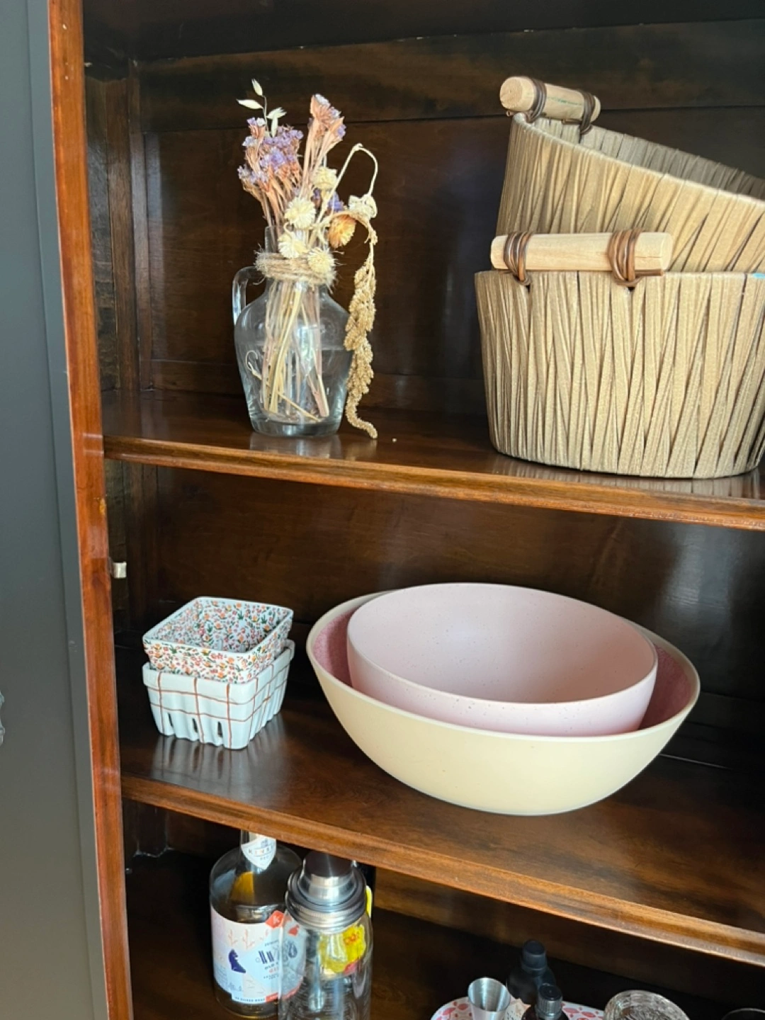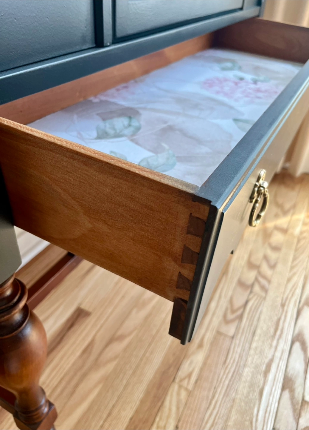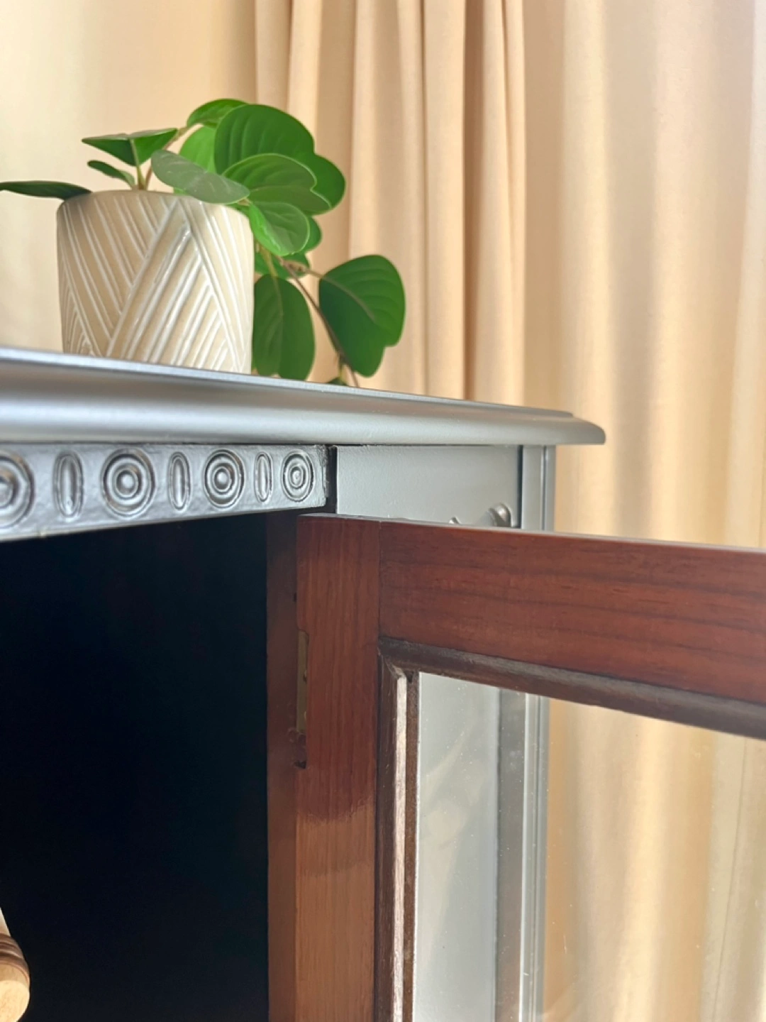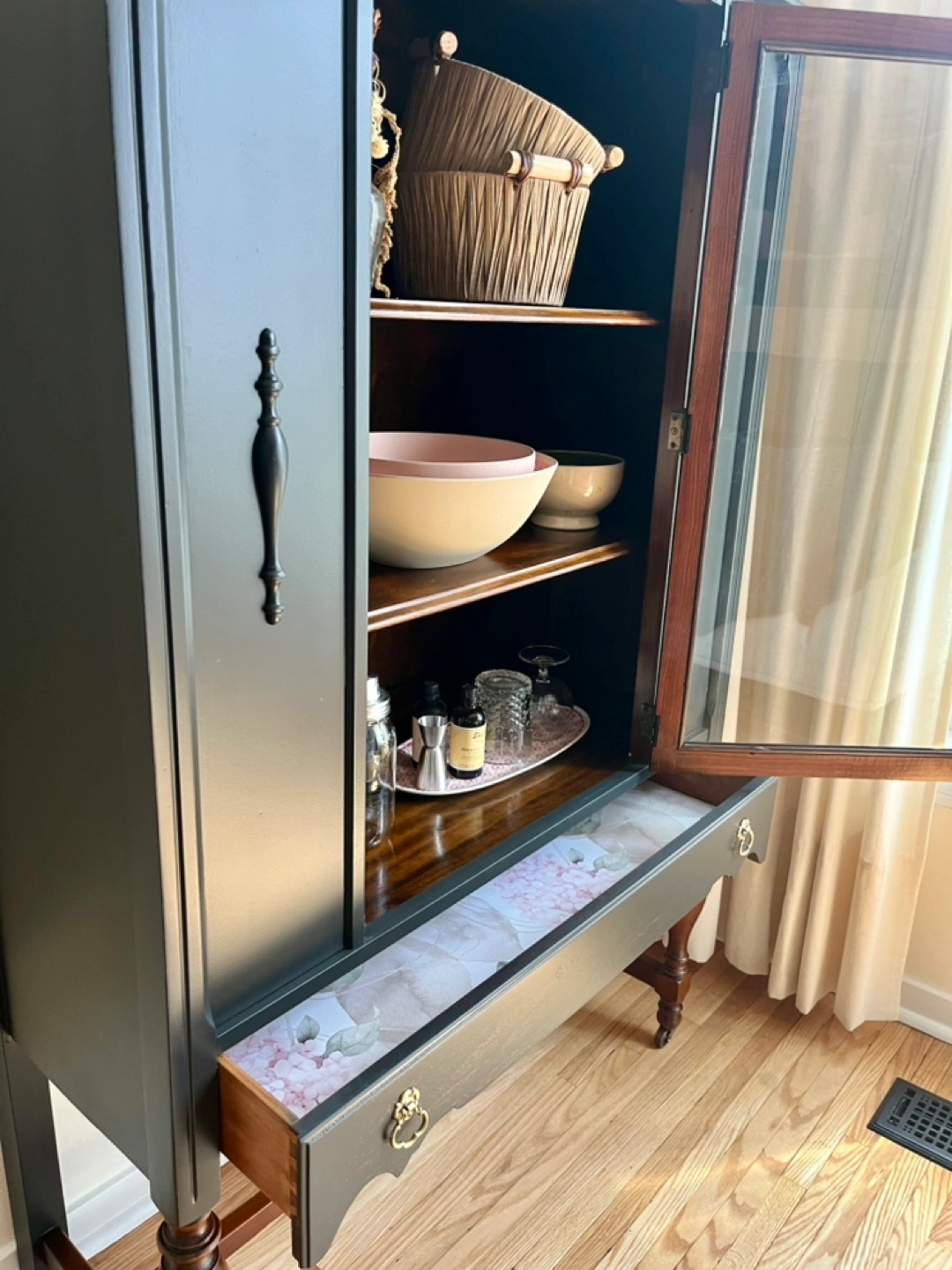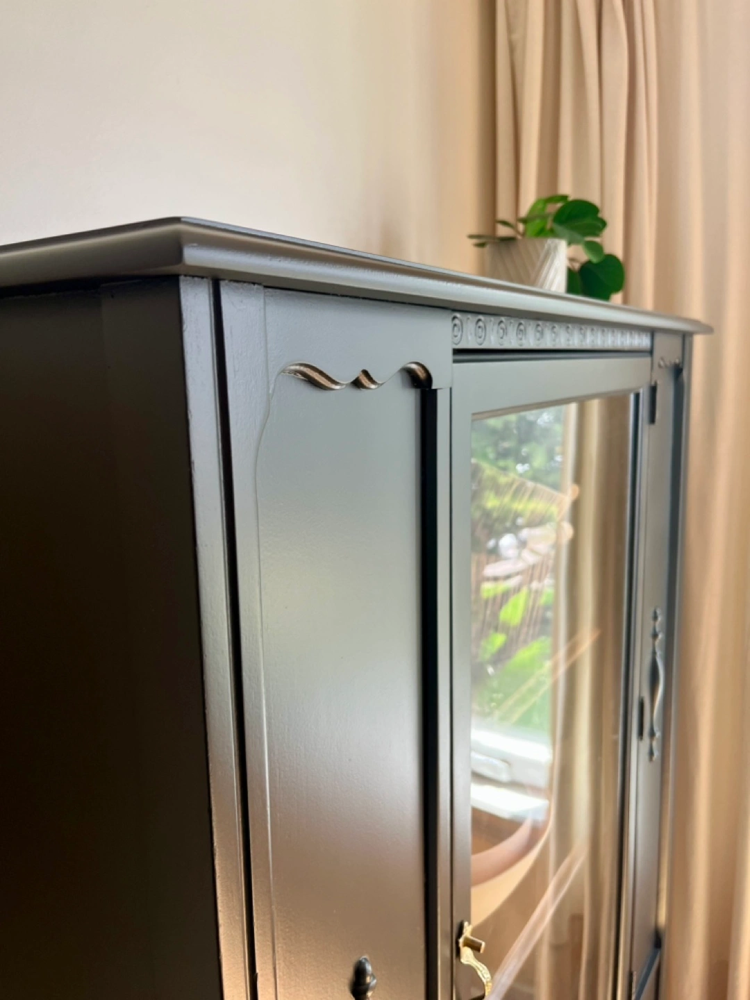 133✨Newly refinished with dove tail drawer✨ This piece is a mix of old and new in the best way! The vintage drawer pulls and wheels perfectly complement the modern mat black and clean glass door. This cabinet contains exposed and concealed storage space. Glass door handle has a latch that keeps the cabinet closed. There are multiple uses for this piece. Would go great in any dining or living area! Can be used more traditionally to house special dishes or can house decor, books, blankets or even as a liquor cabinet 🍸 It’s like open storage without all the dust accumulation! Dimensions H 59” W 37” D “14 Top shelf height 12” Middle shelf height 10” Bottom shelf height 11.5” The hardware is all original and cleaned to bring back to life in their antique gold colouring. The wheels are also original and have been scrubbed clean so they roll better. The beautifully shaped furniture legs have been restained in the original mahogany colour. Piece was completely cleaned. Body was primed and spray painted in a gorgeous furniture paint colour called Ash and top coated for durability. The furniture legs were stained using a mahogany gel stain and top coated with a wipe on poly for durability. The inside was has expected wear for the pieces age and has been coated in a gel stain and sealed with wipe on poly. The drawer was sanded, wood was conditioned and paper added to the bottom. Hardware was all scrubbed with bar keepers friend. Around Liverpool & Bayly.