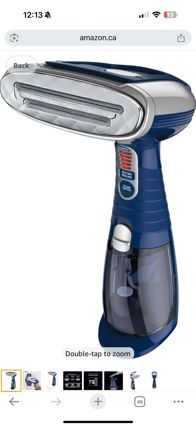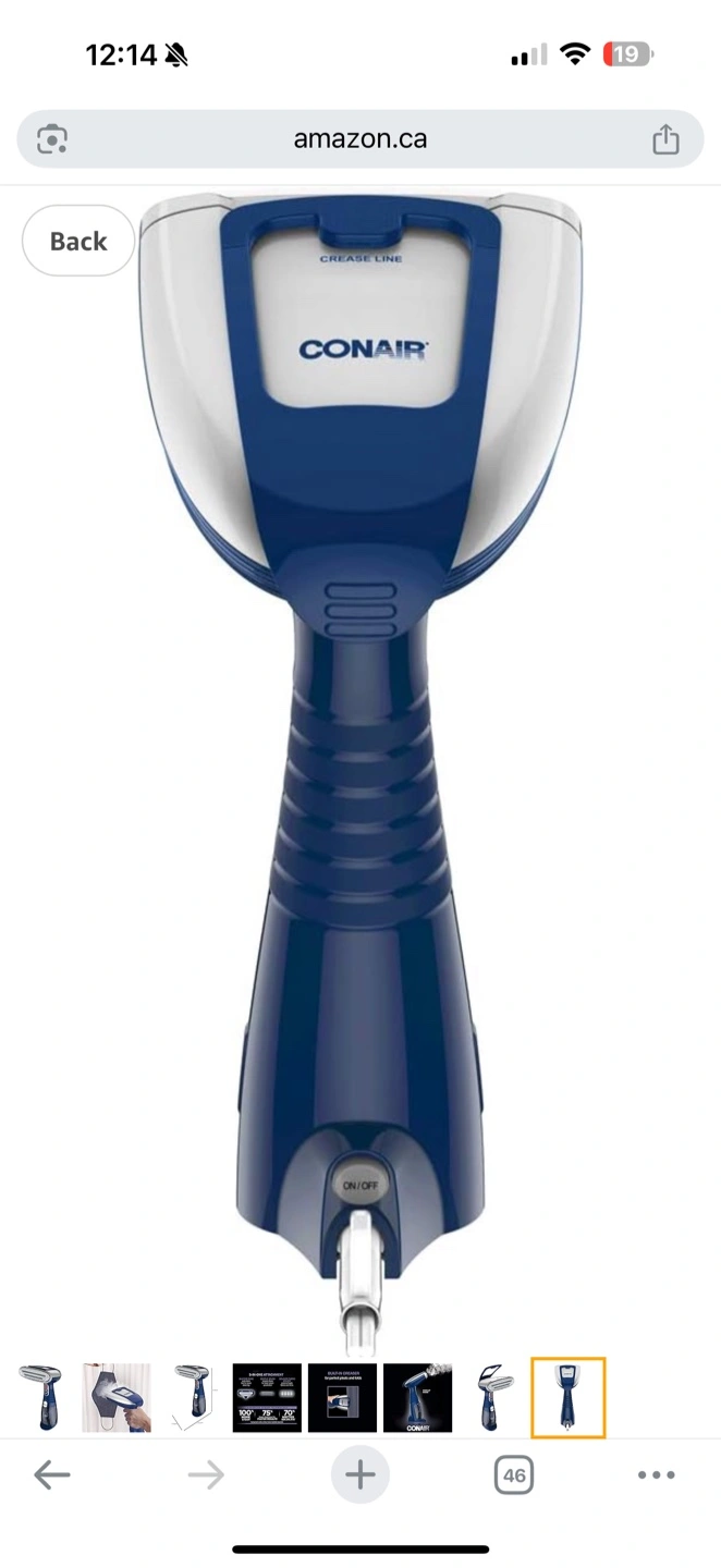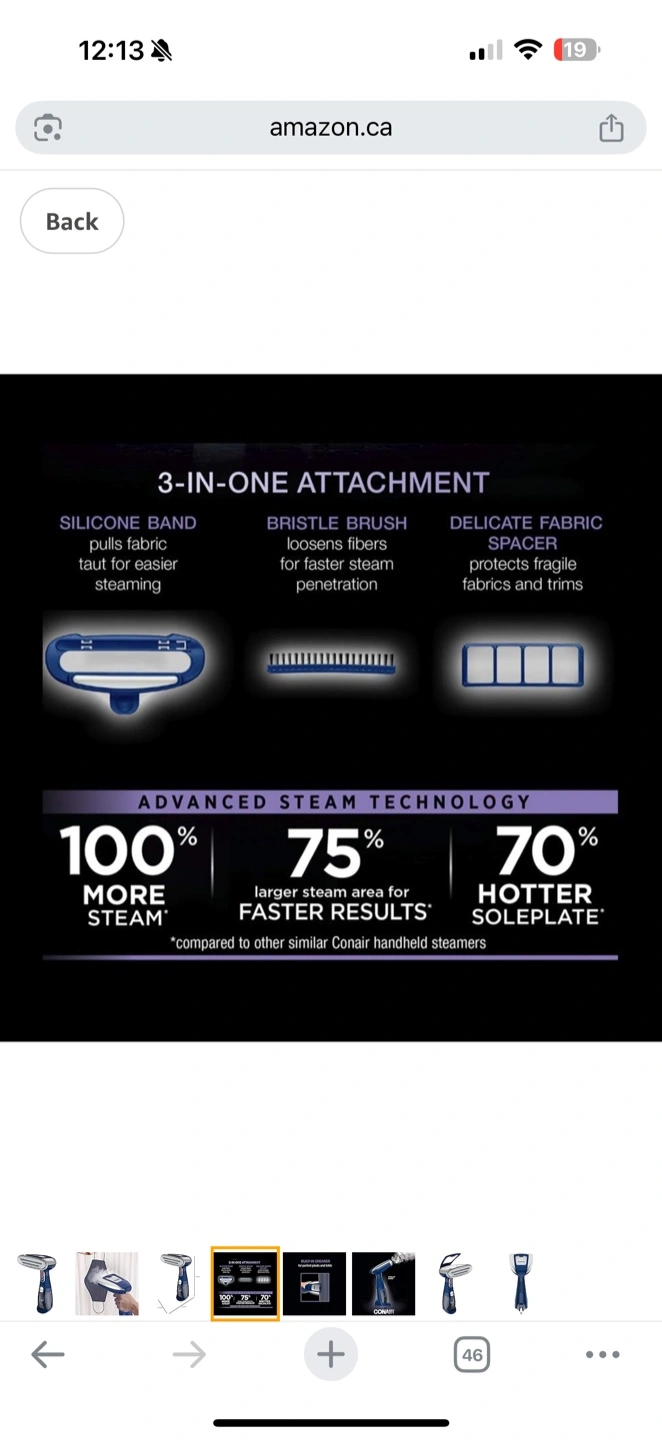 Conair handheld fabric steamer. Three-in-one attachment. Built-in creaser. Advanced steam technology. Great for clothes and fabrics.