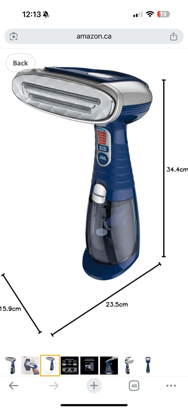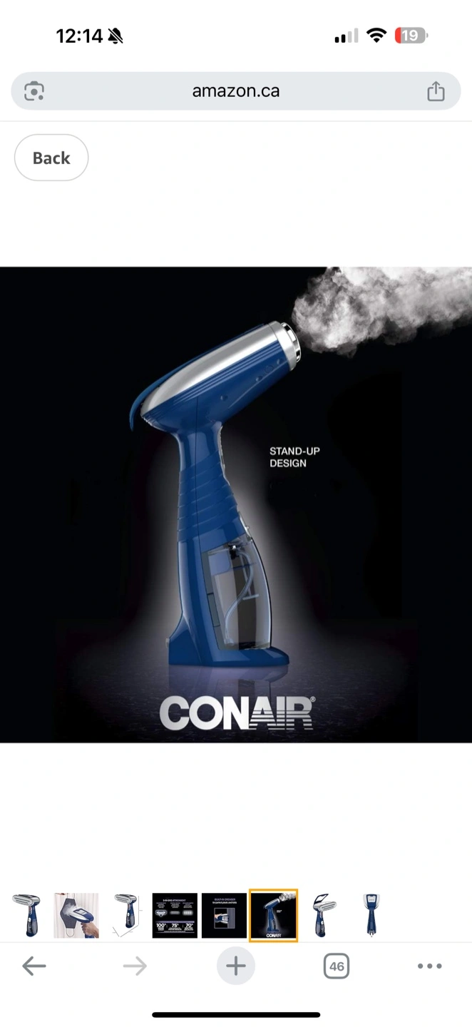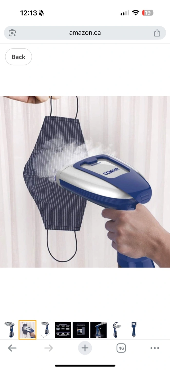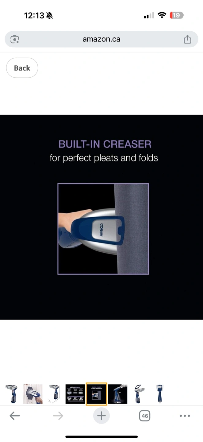 Conair handheld fabric steamer. Three-in-one attachment. Built-in creaser. Advanced steam technology. Great for clothes and fabrics.