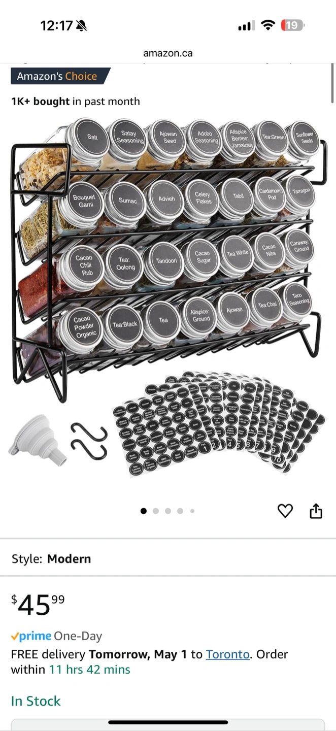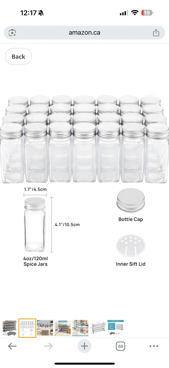 Organize your spices with this modern spice rack. Includes 24 clear glass spice jars with silver lids and inner sifter lids. Comes with labels for easy identification. Great for any kitchen.
