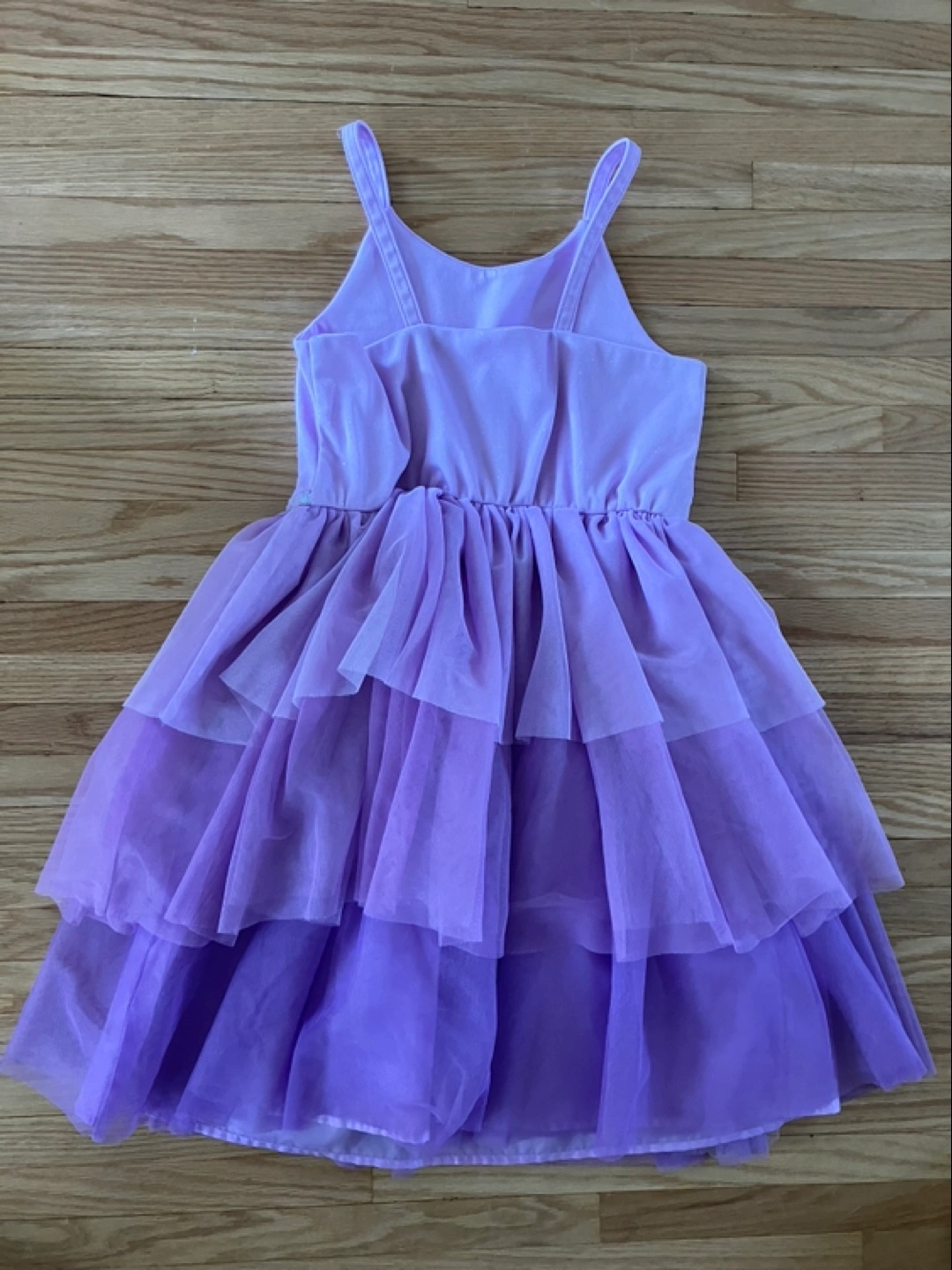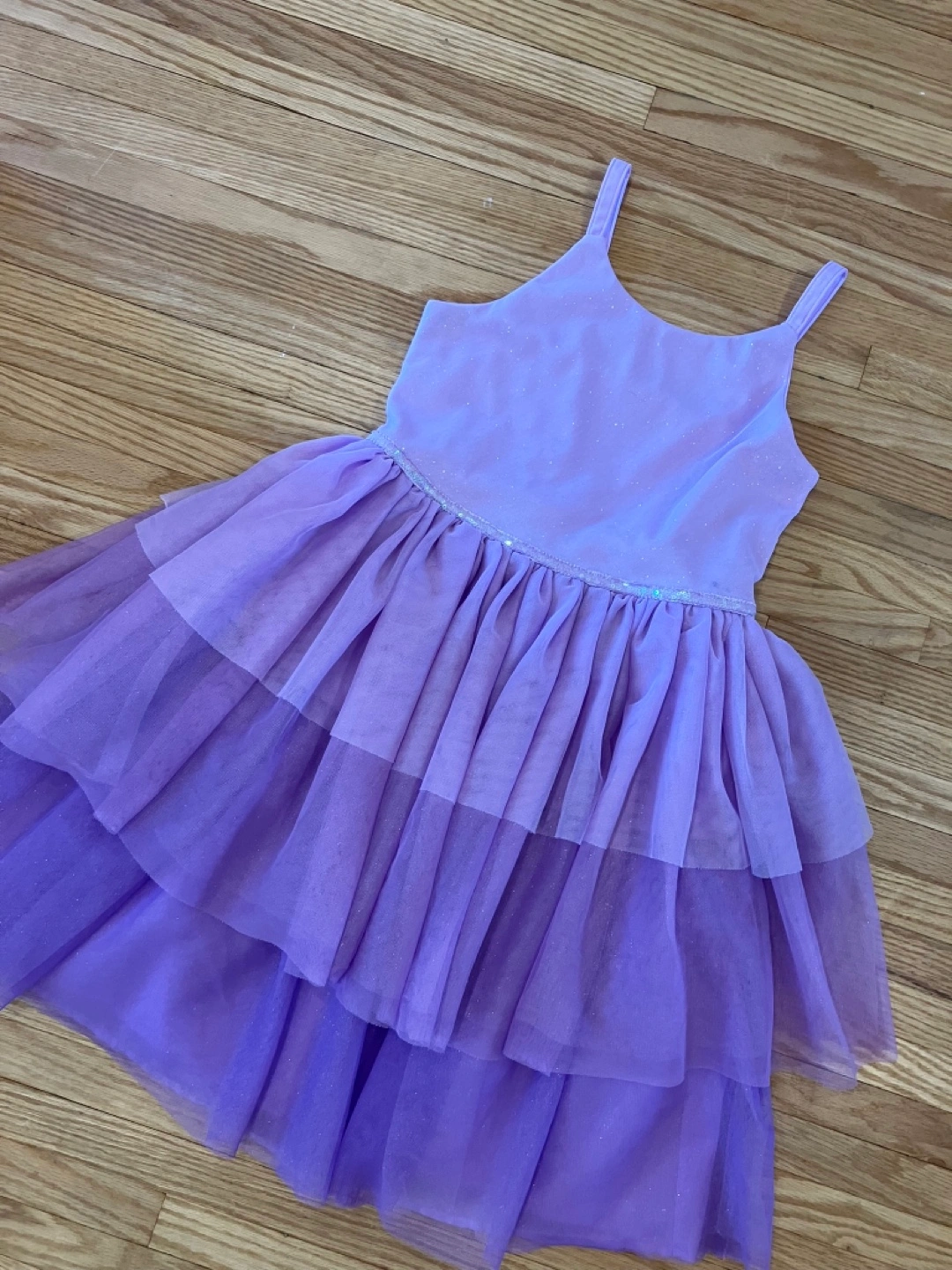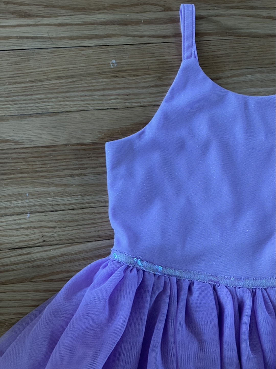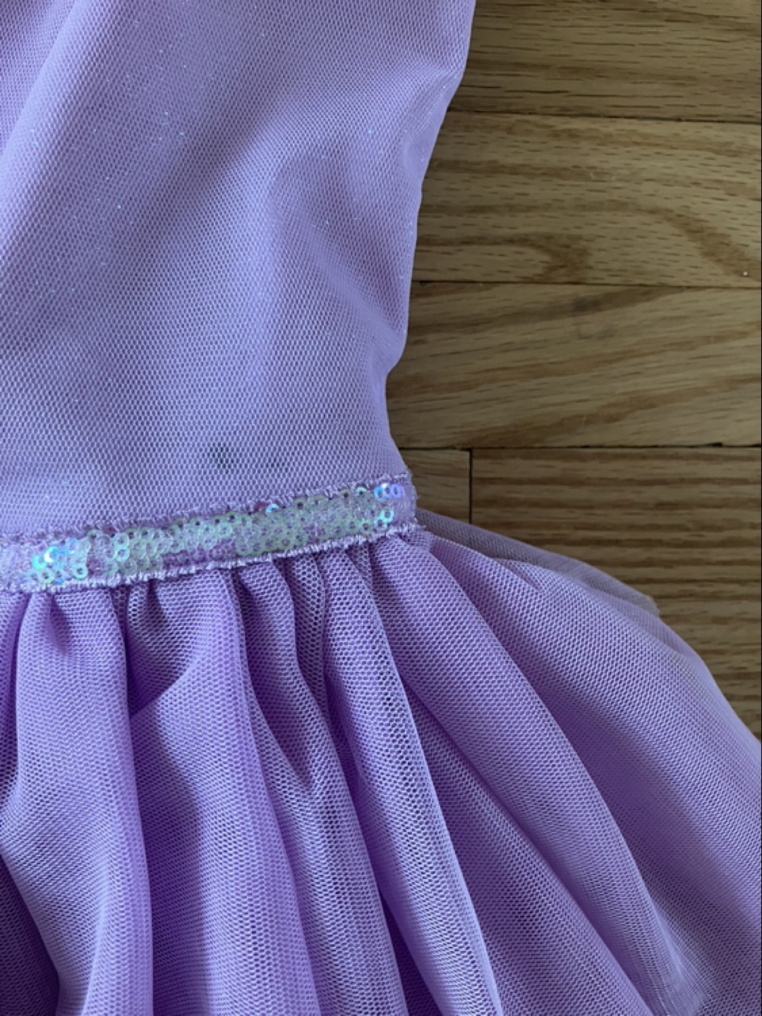 The top is shimmery with a mesh tile overlay. The waist has a sequinned accent and then the skirt part is soft tule that puffs out. The colours of the skirt are a gradient purple getting darker each layer. There is a mark as seen in the second last photo on the one side.