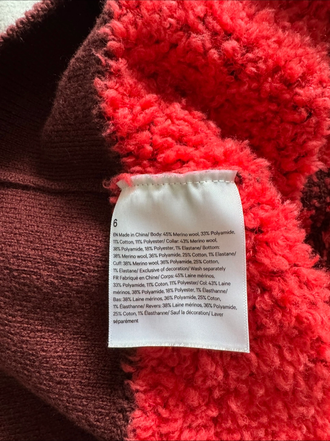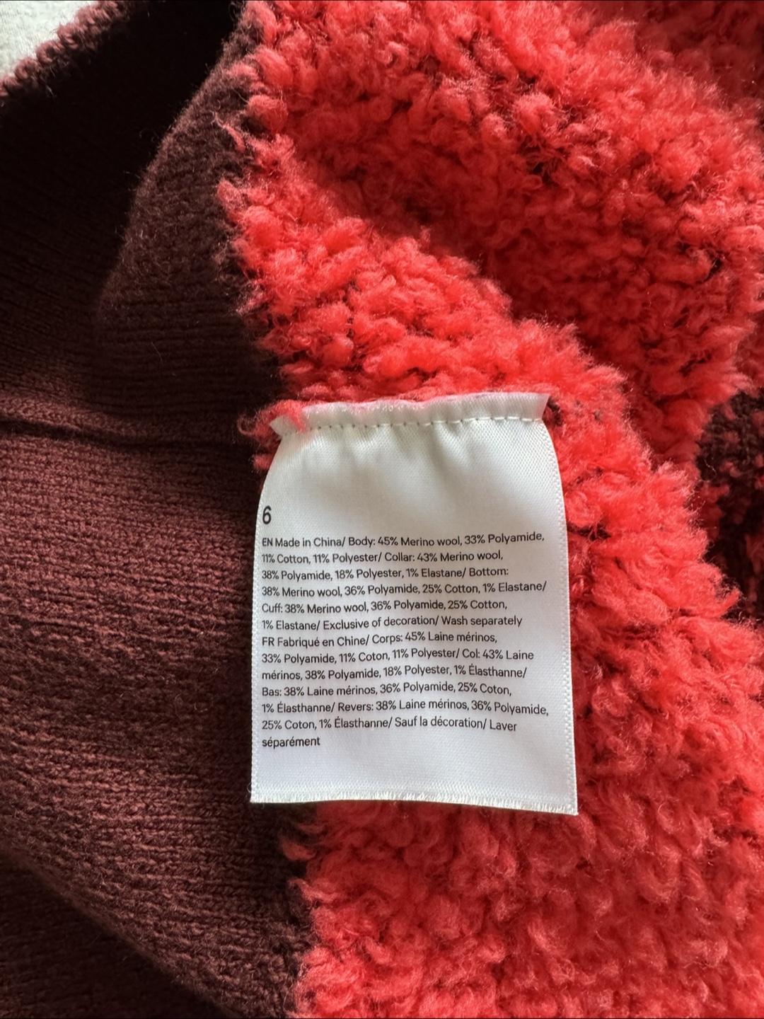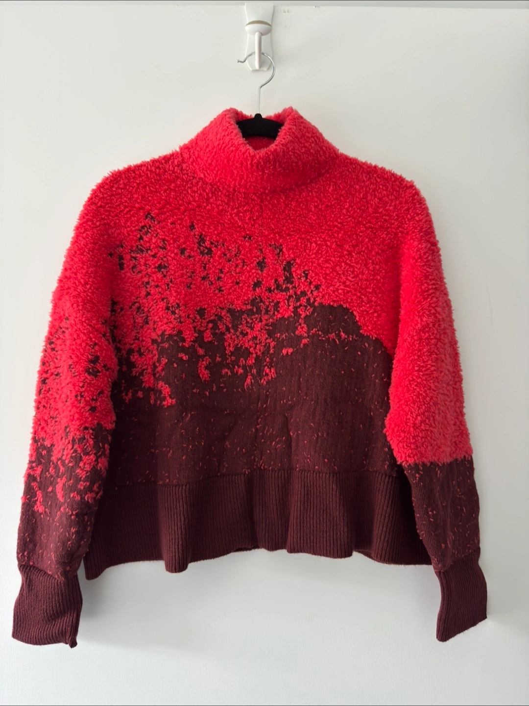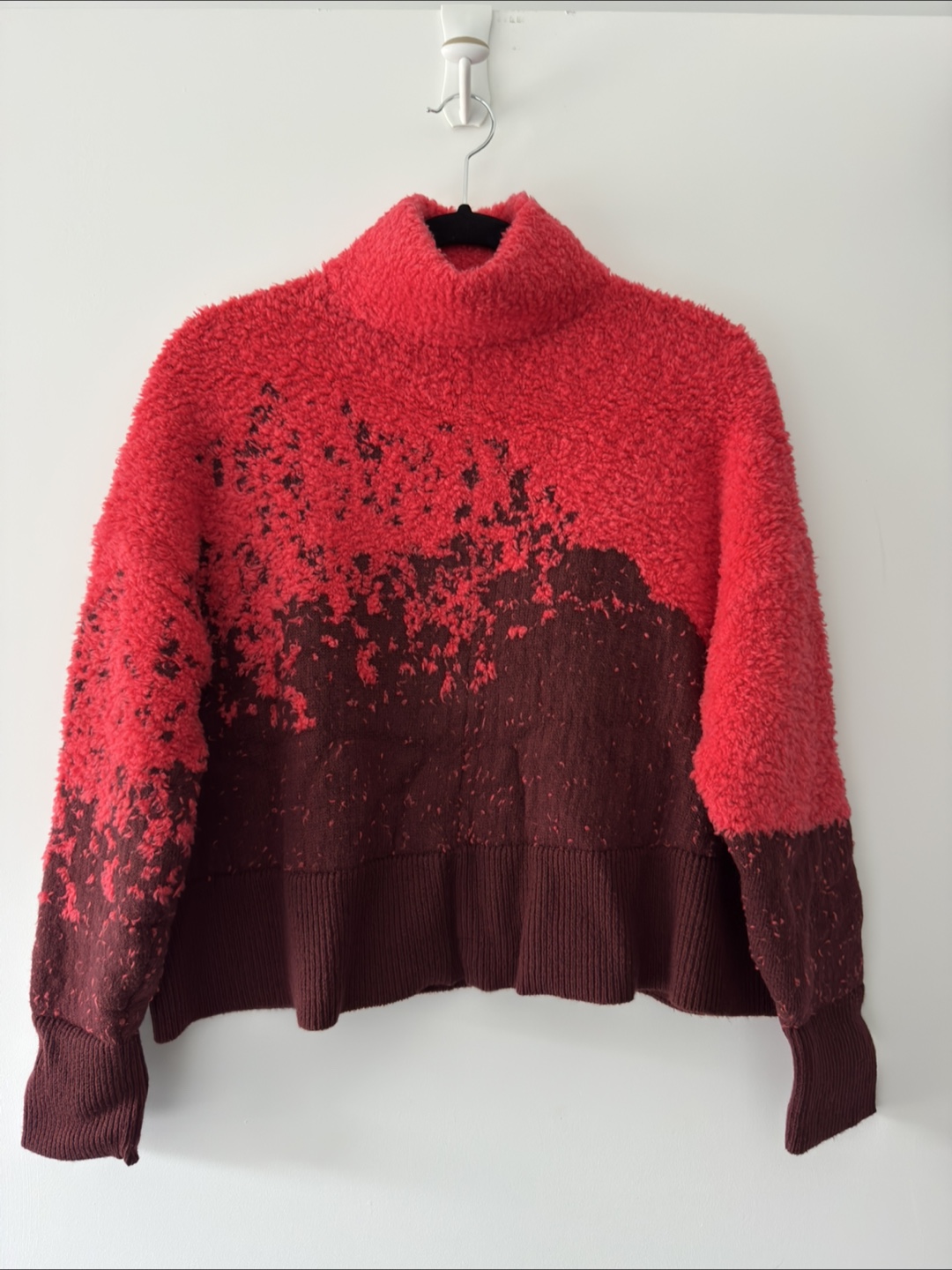 Women's size 6 cropped mock neck sweater. Red and maroon colour block design. Fuzzy, textured material. Made in China.