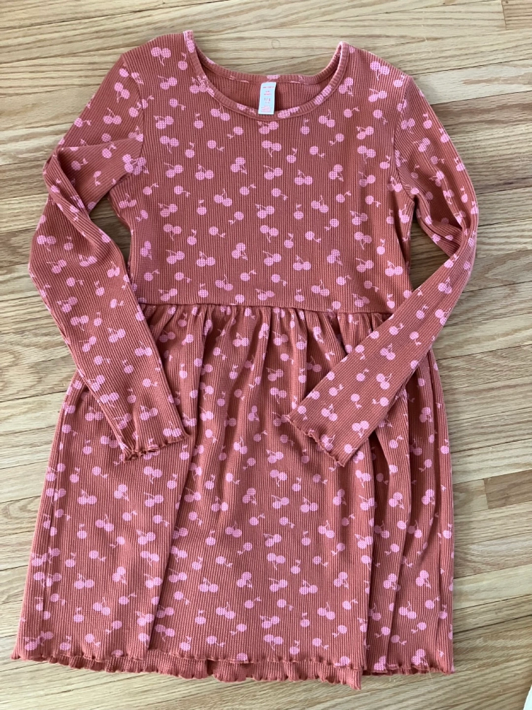 Red cherry dress - size L. Waffle pattern material with ruffles at the sleeves and dress hem. Makes this play dress less casual.