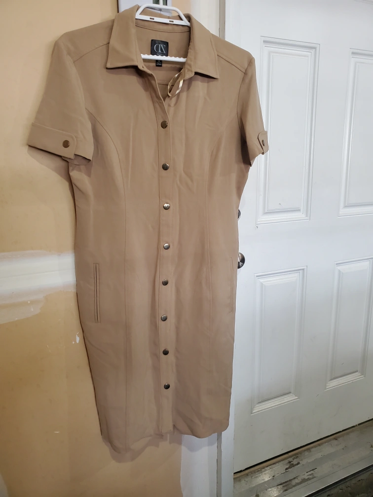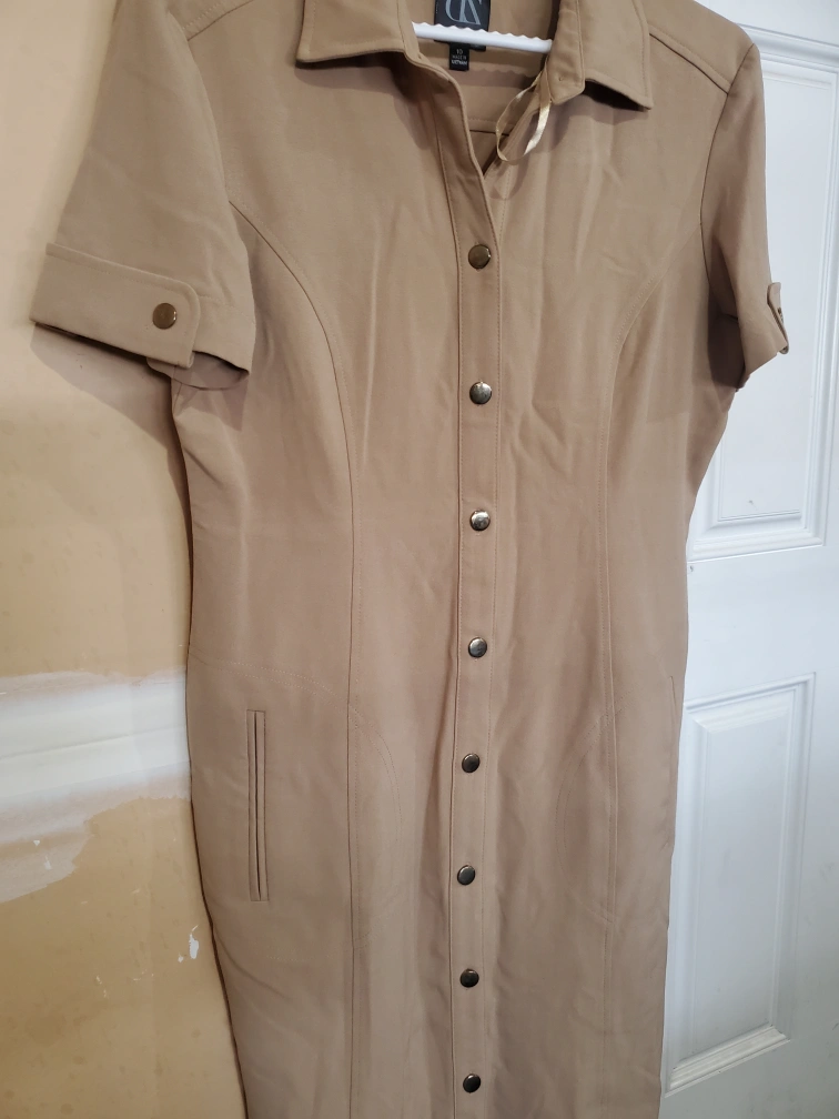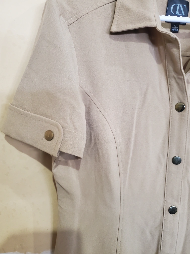 Classic beige shirt dress. Short sleeves, button-front closure. Two false pockets. Made in Vietnam.