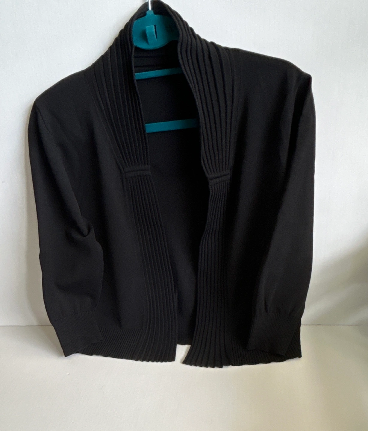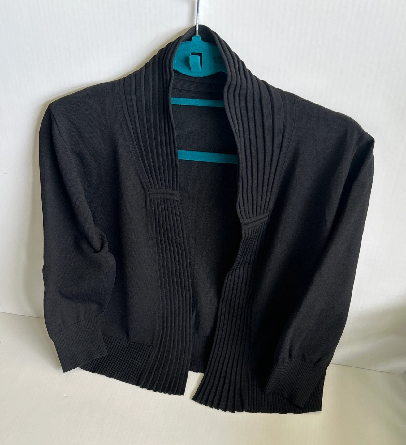 Olsen - Black short-sleeve cardigan. Pleated detail down the front. Open front, no closures. Soft material. Excellent quality and condition. Clean and ready to wear. True colour is BLACK. Smoke/Pet free home. Cash and Pick Up only.