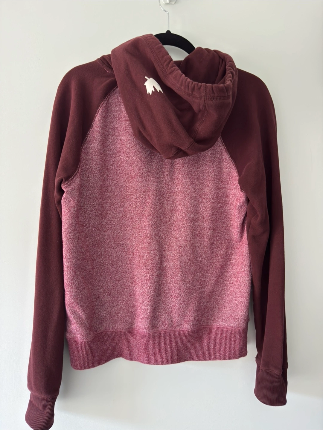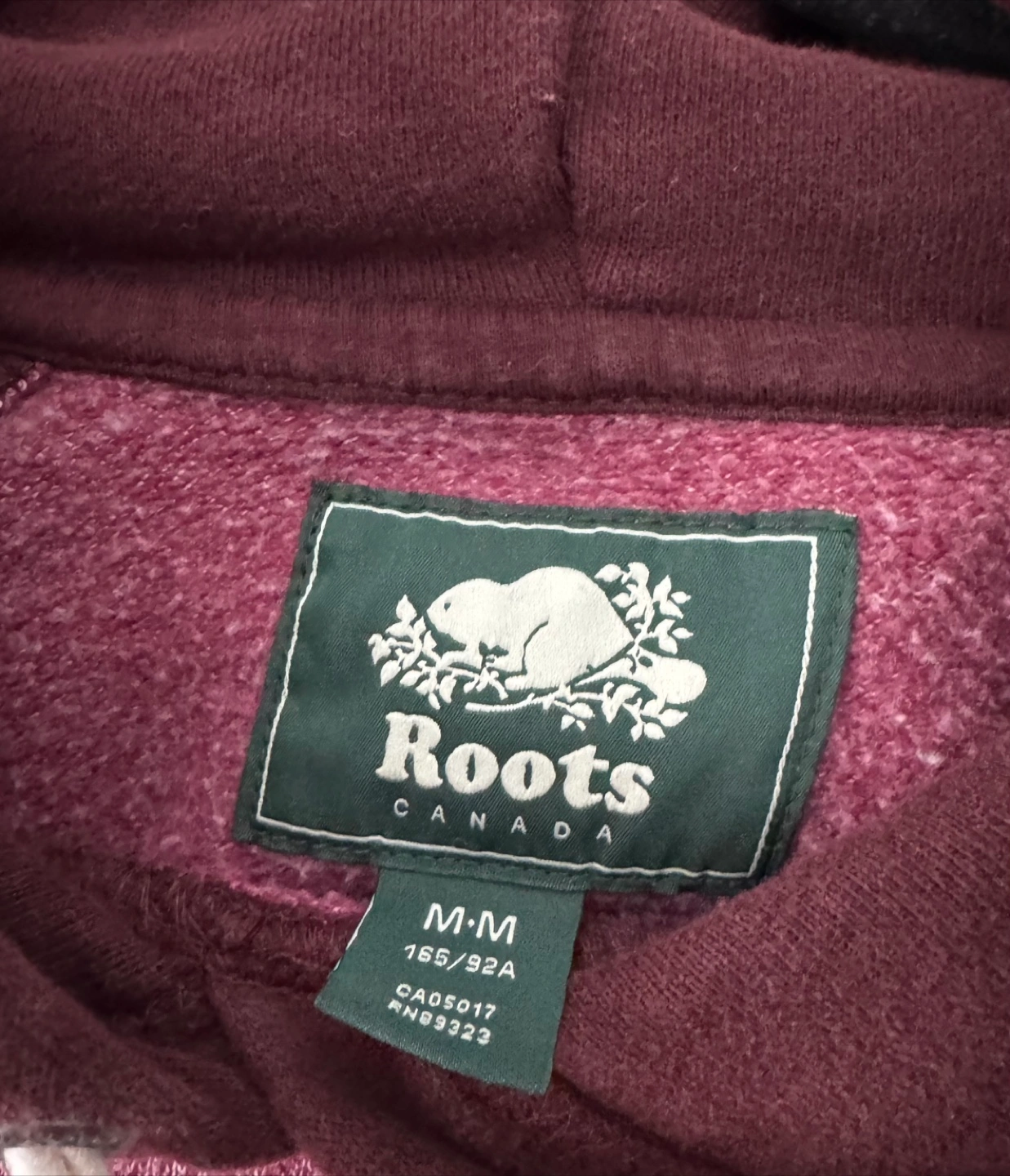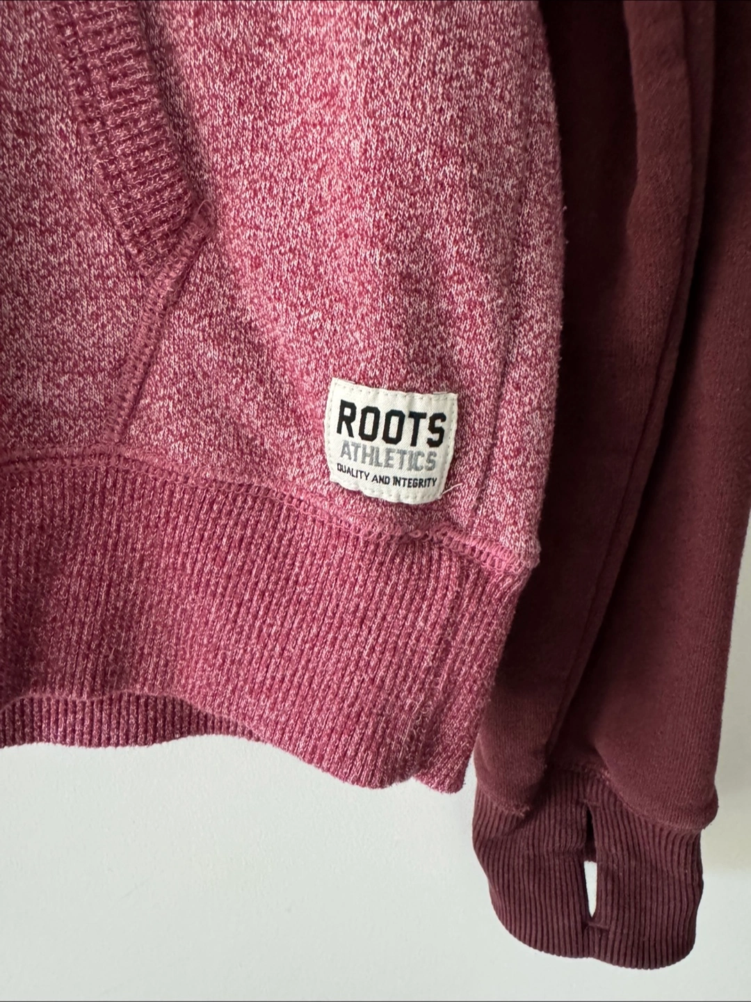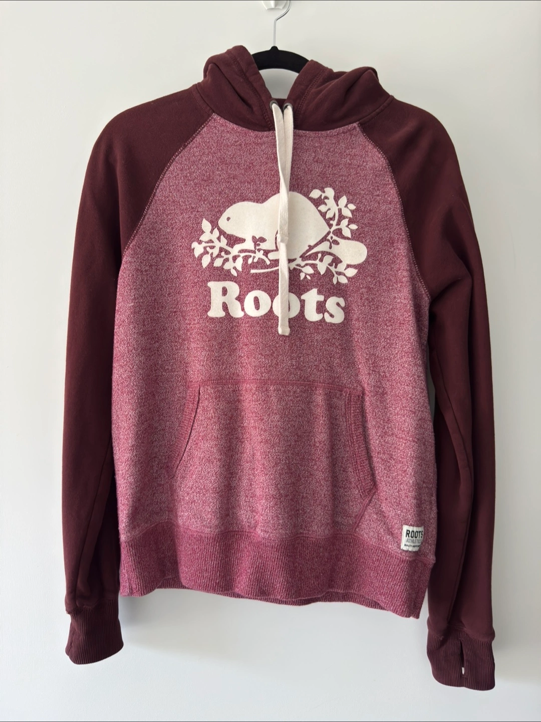 Women's maroon Roots Athletics hoodie. Size medium. Features a beaver logo and contrasting sleeves. Soft material. Drawstring hood. Front pocket. RARELY used.