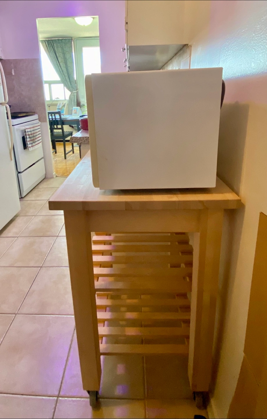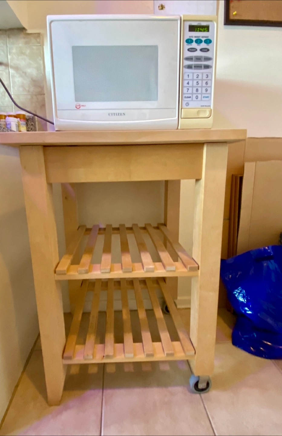 Light wood kitchen caddy. Two shelves, rolling casters. Good condition.