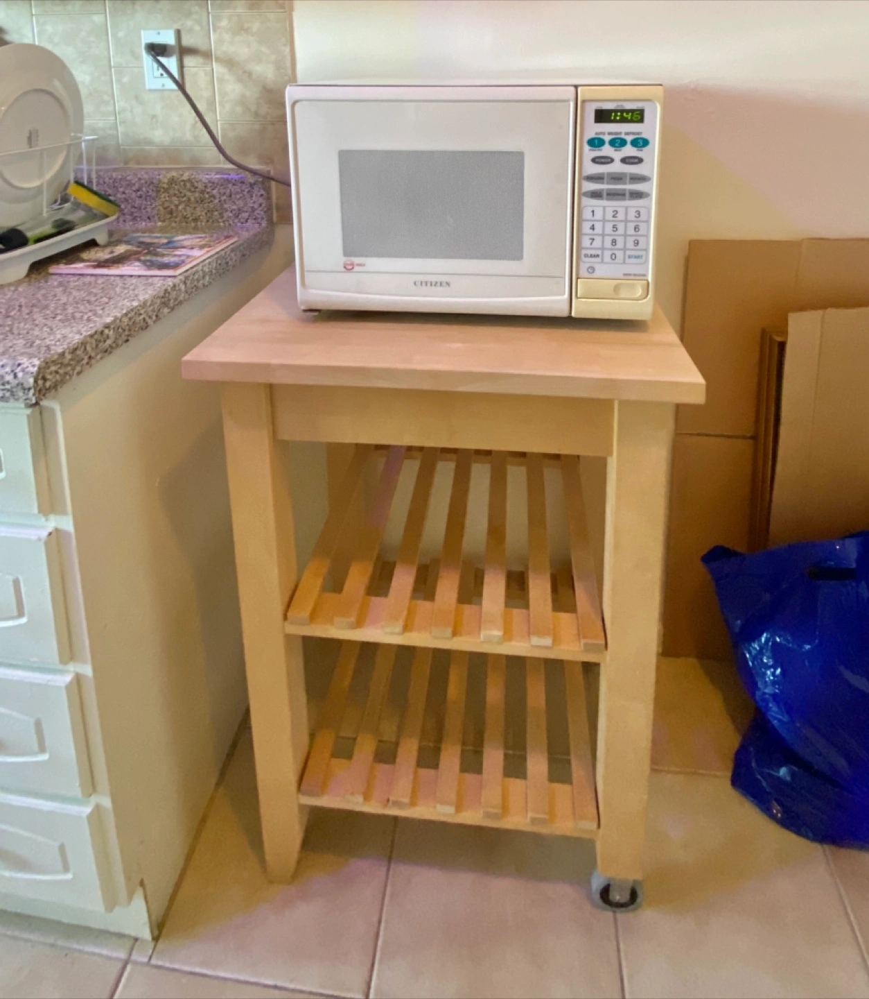 Used as a microwave stand and to store recipe books and other kitchen supplies.