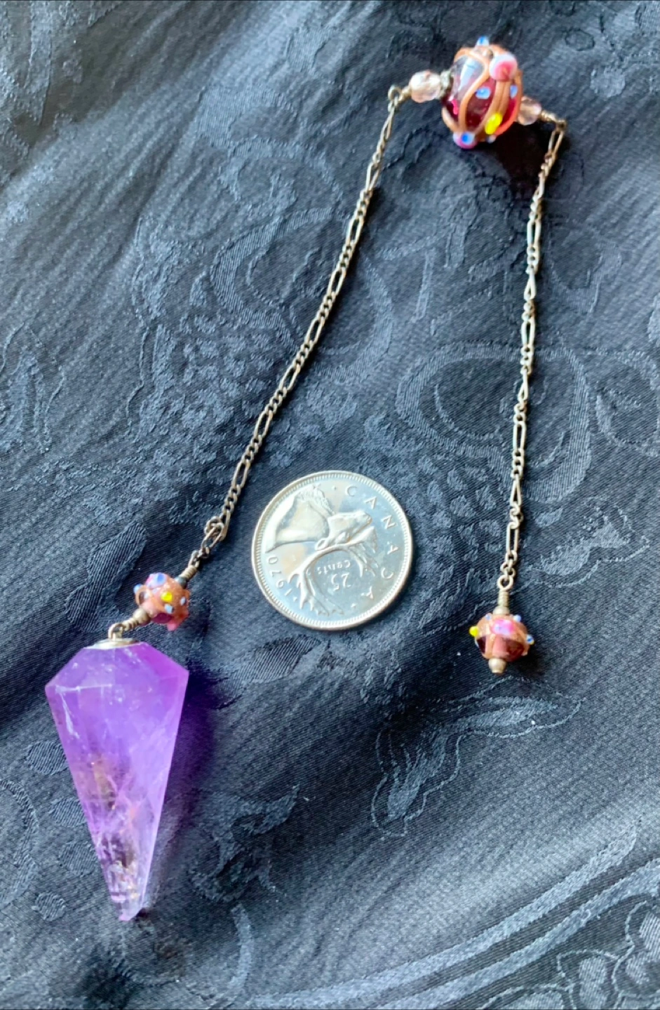 Beautiful amethyst point pendulum. Features a long silver chain and three Murano glass accents. Perfect for divination or crystal healing.