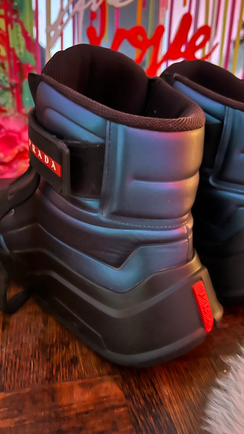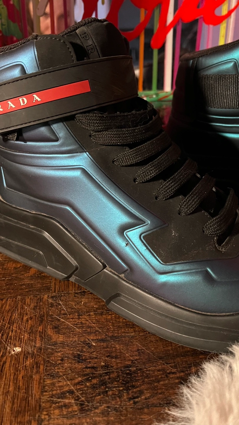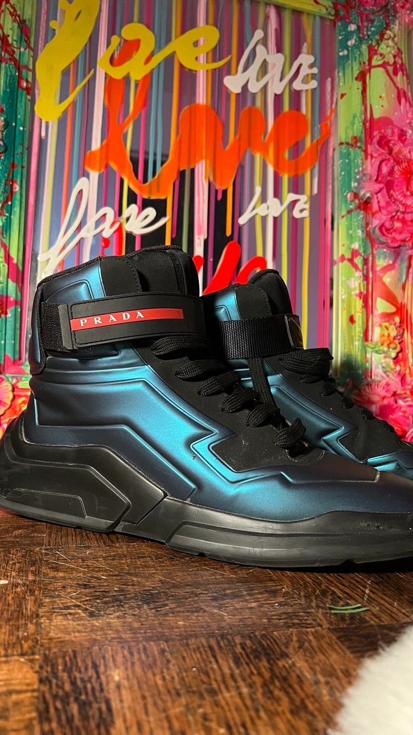 Metallic blue and black high-top sneakers. Features a chunky sole and velcro strap. Lace-up closure. ✨ it’s pre owned I don’t know its original or not so price is low.✨ last price don’t make offer.