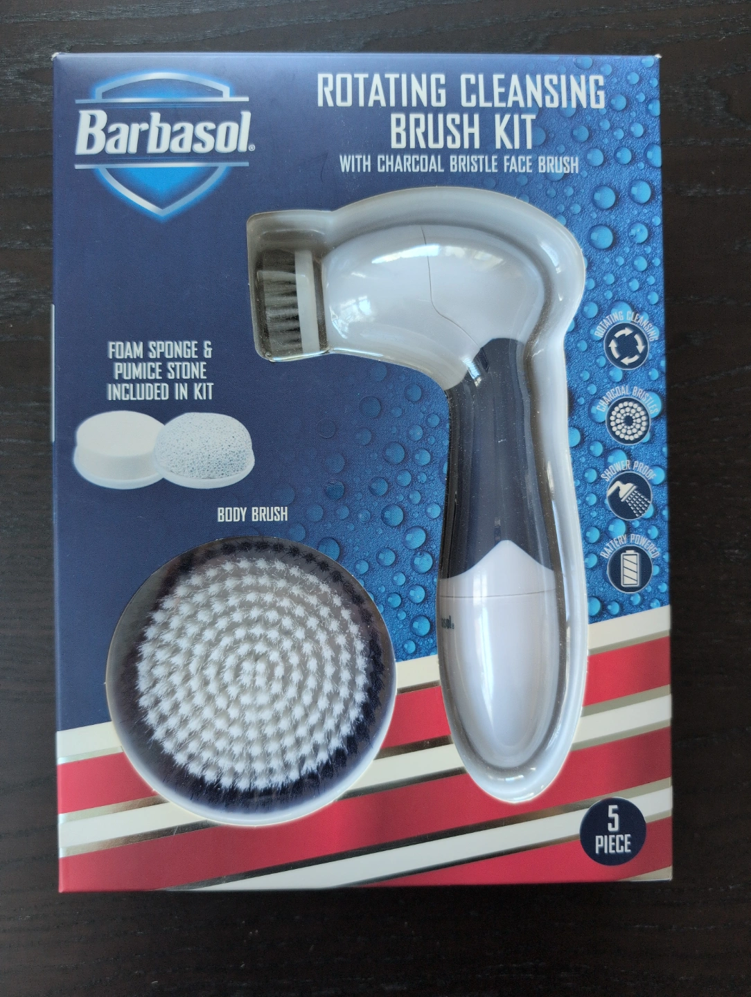 5-piece kit. Includes charcoal bristle face brush, foam sponge, pumice stone, and body brush. Battery-powered. Shower-proof. Gentle cleansing and exfoliation. Eliminates impurities. Battery not included.