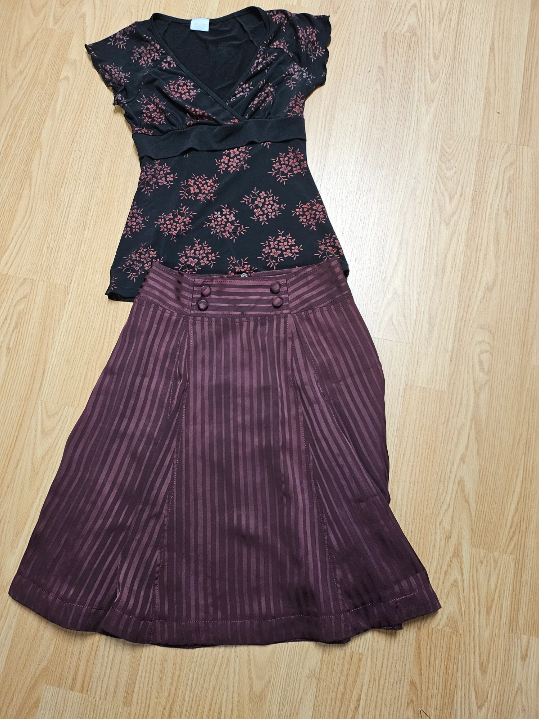 Women's outfit. Maroon striped midi skirt, size 8. Black floral print top size xs Both pieces appear to be in good condition. Perfect for a casual or semi-formal occasion.