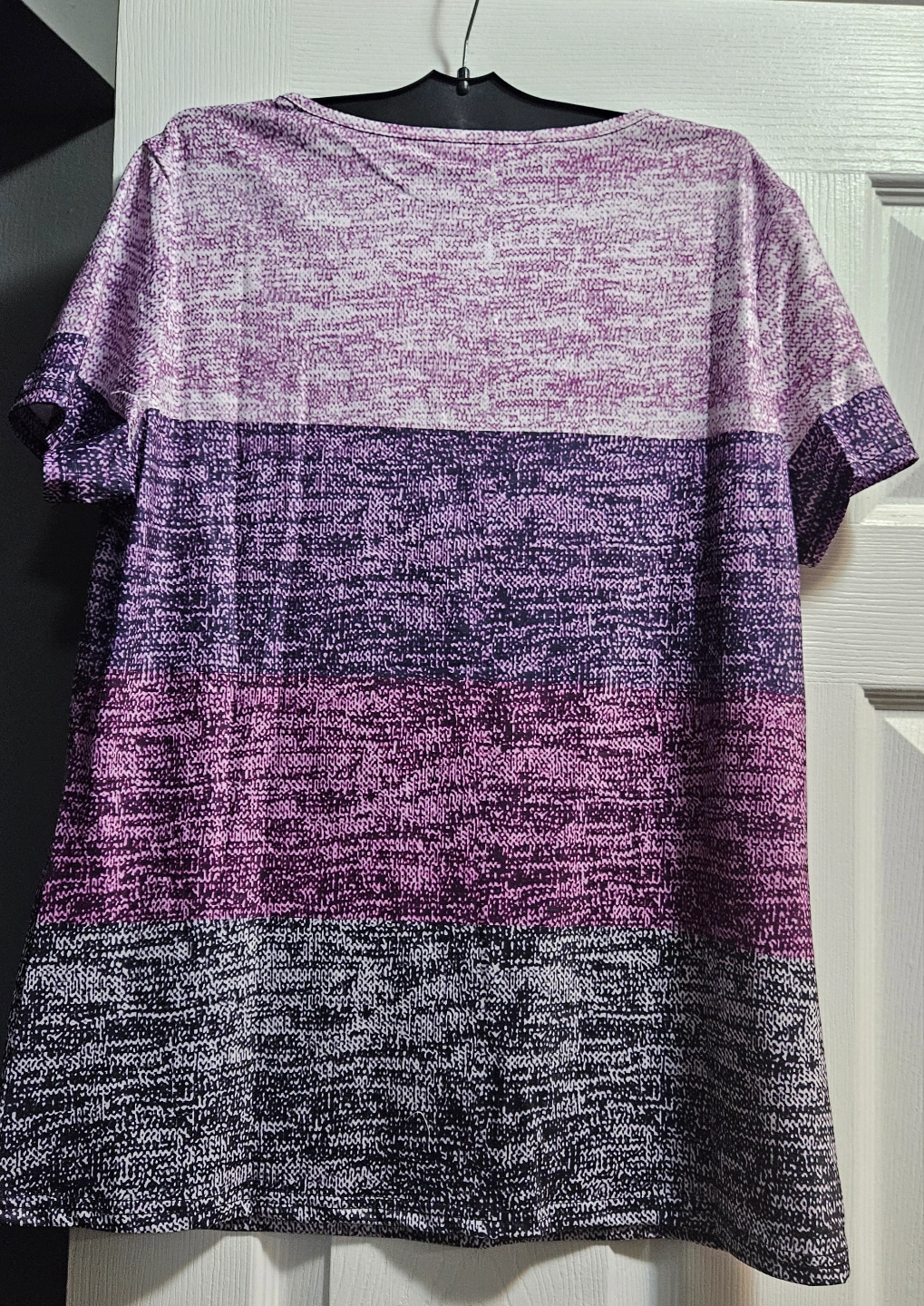 Short sleeve, V-neck shirt. Features a horizontal multicoloured striped pattern. Relaxed fit.