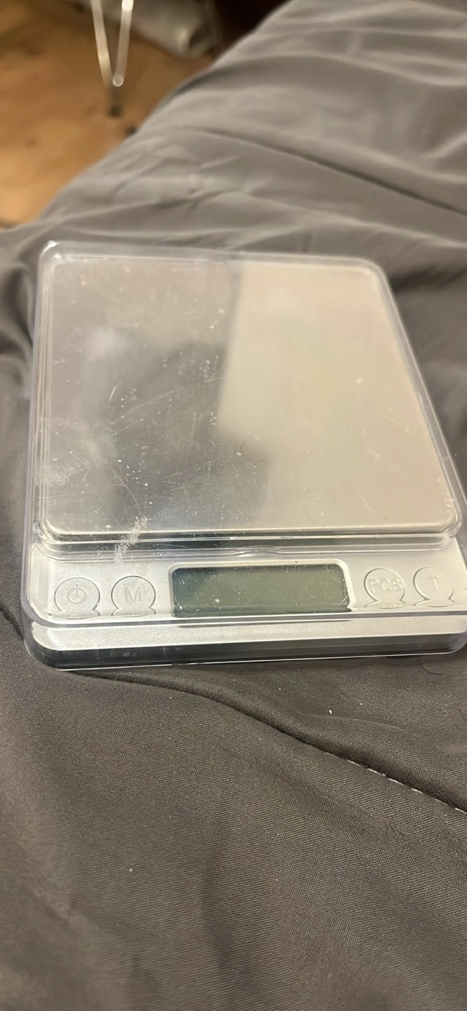Small digital scale. Weighs in grams, ounces, and other units. Features tare and mode functions. Comes with protective cover.