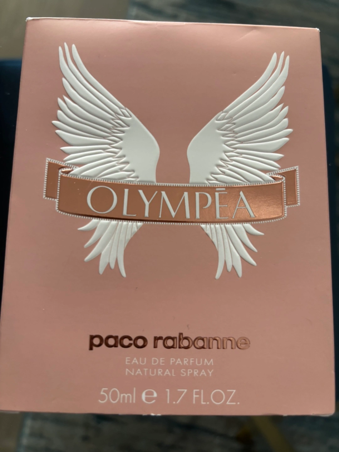 50ml Eau de Parfum natural spray. Pink box features embossed wings and rose gold accents. Olympéa.