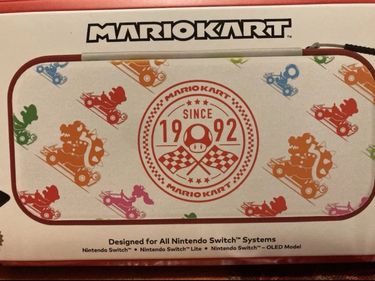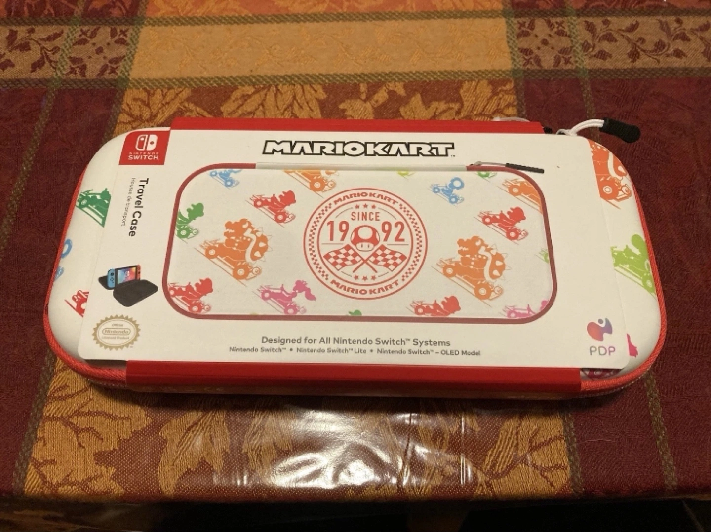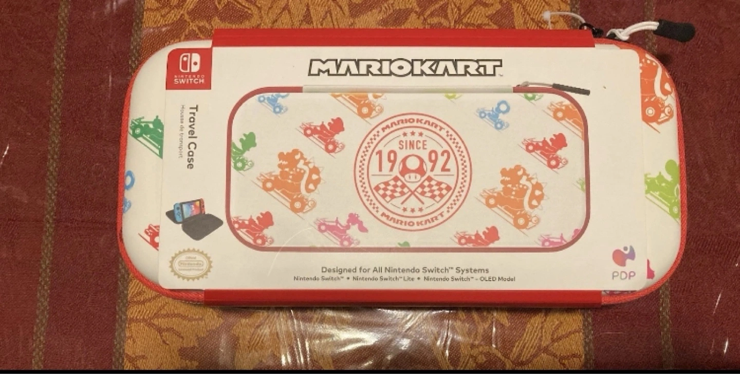 New, officially licensed Nintendo Switch travel case. Features Mario Kart design. Works with all Switch models. Includes built-in stand and storage for accessories.