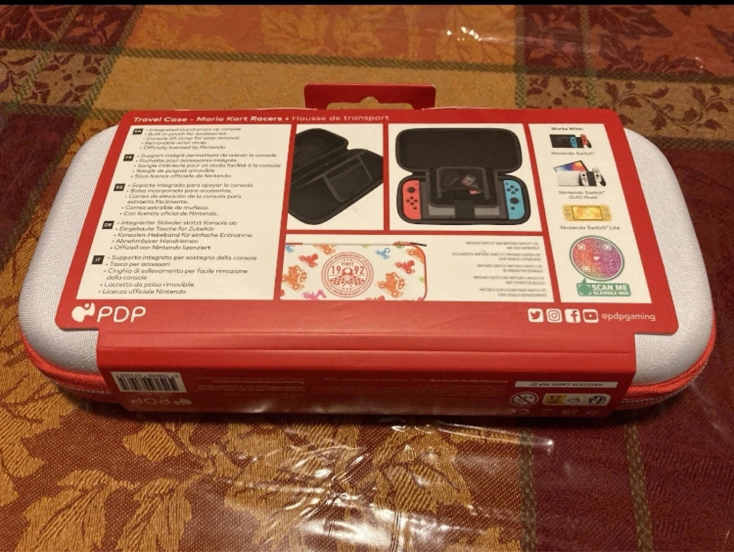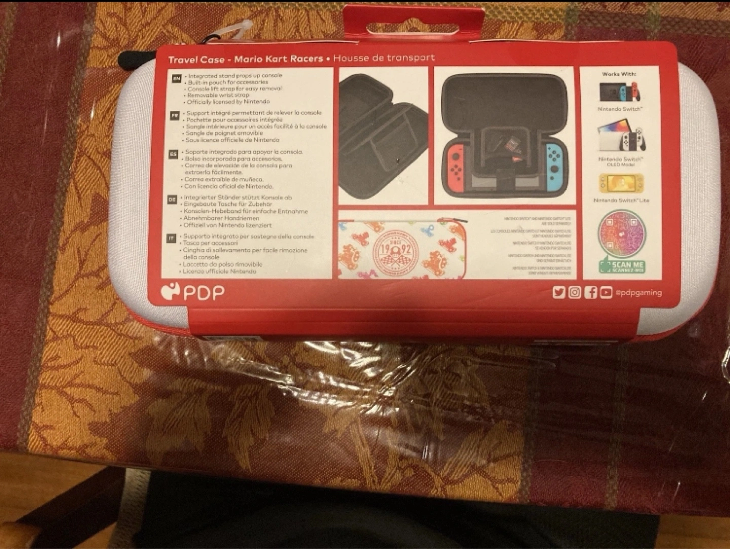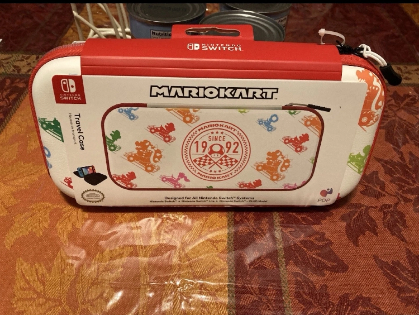 New, officially licensed Nintendo Switch travel case. Features Mario Kart design. Works with all Switch models. Includes built-in stand and storage for accessories.