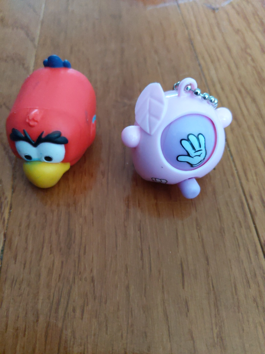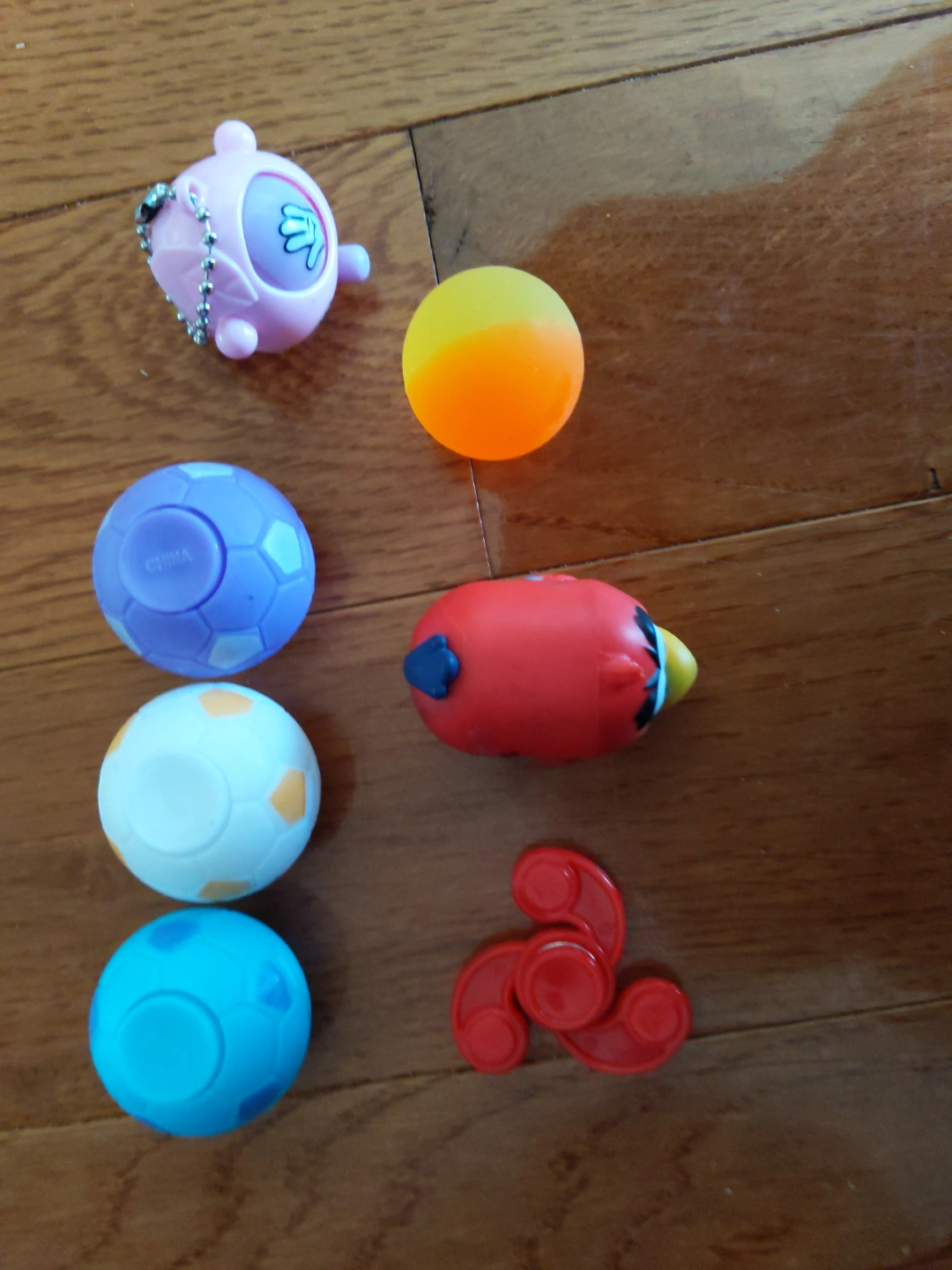 Assortment of small fidget toys. Includes 3 soccer ball spinners, 1 red Angry Bird, 1 pink hand spinner keychain, 1 orange ball spinner, and 1 red three-piece spinner. Great for kids or adults.