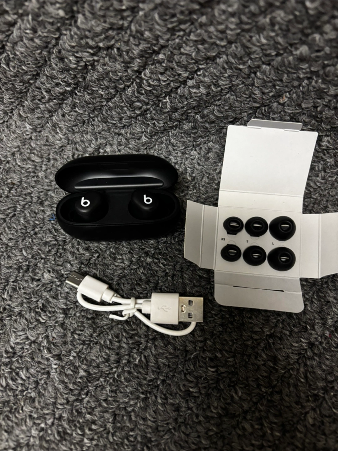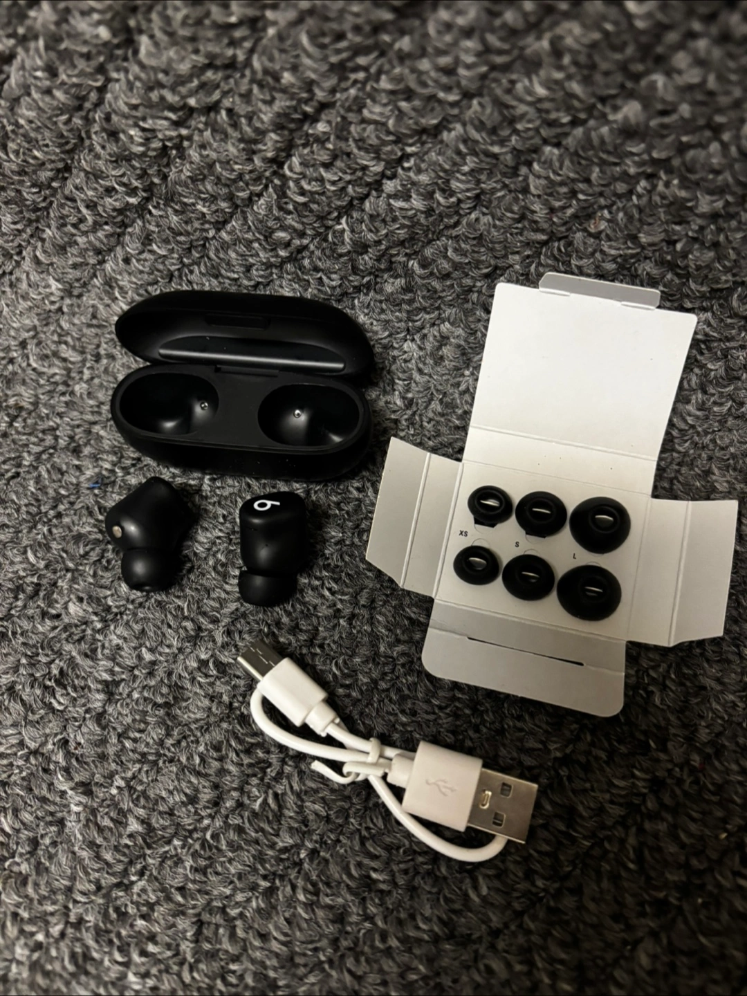 Black wireless earbuds, charging case, USB-C charging cable, and extra ear tips included. Great sound quality. Portable and convenient.