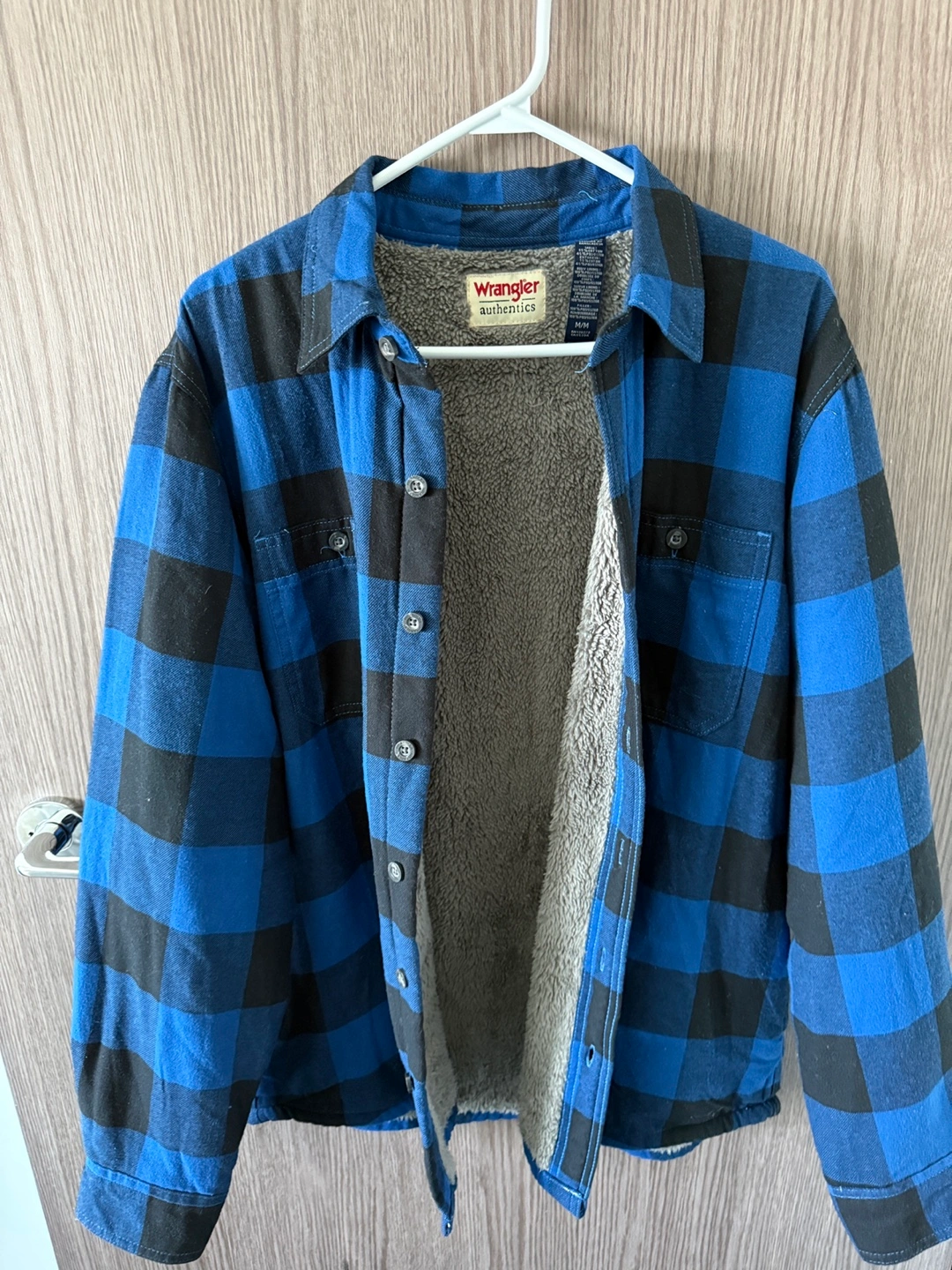 Blue and black buffalo check pattern. Warm sherpa lining. Long sleeves. Button closure. Men's medium.