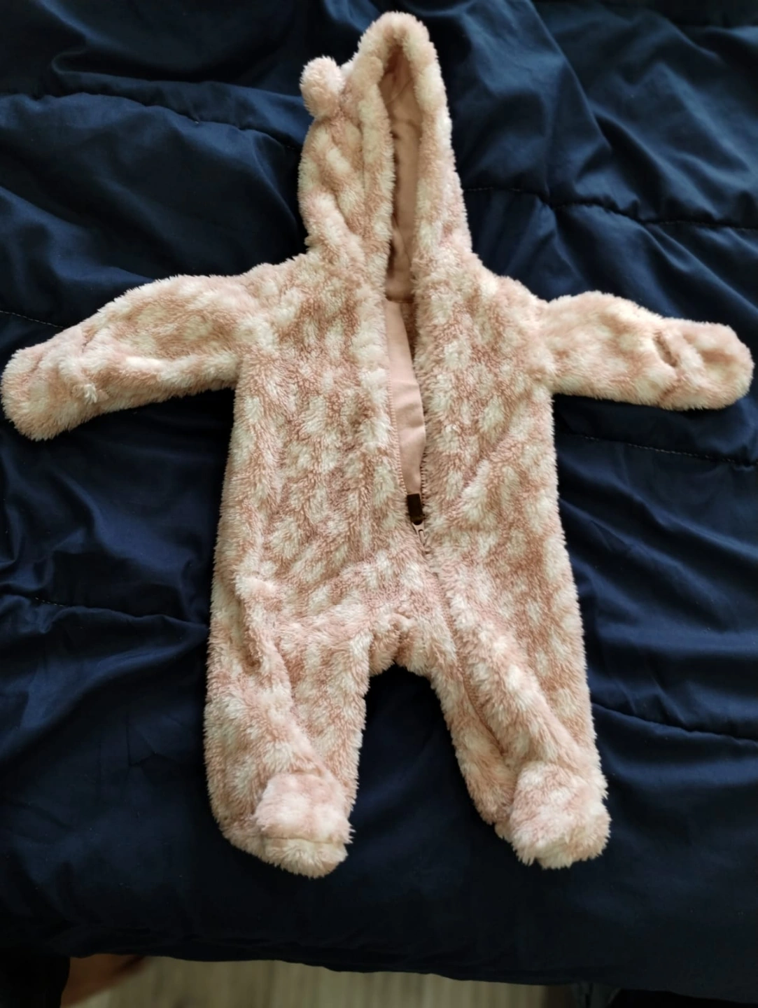Super cute newborn baby snowsuit. Pink fuzzy material. Features a hood with bear ears. Zip closure. Perfect for keeping your little one warm.