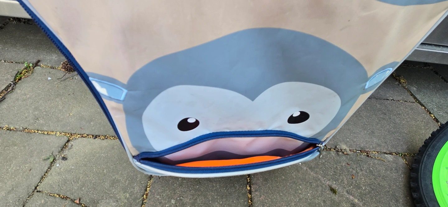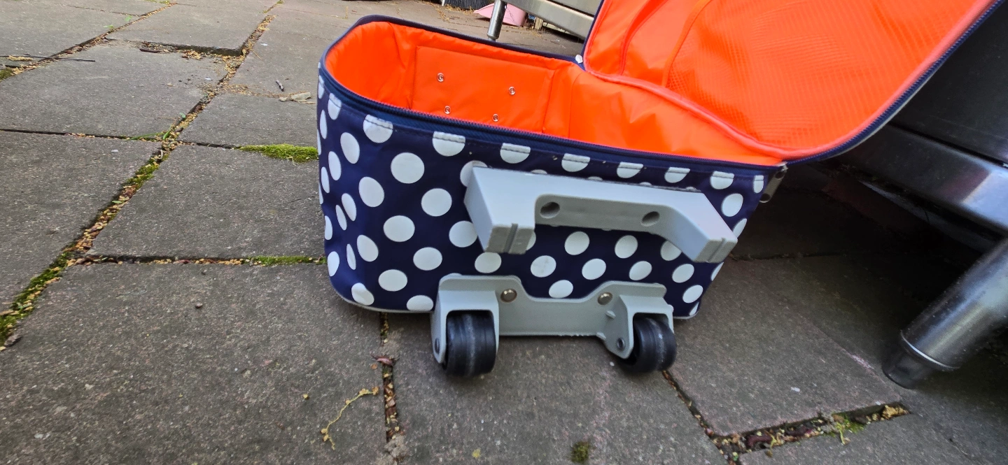 Cute kids' rolling suitcase. Features a hippo design. Durable fabric. Two wheels. Retractable handle. Interior is orange. Small front pocket.