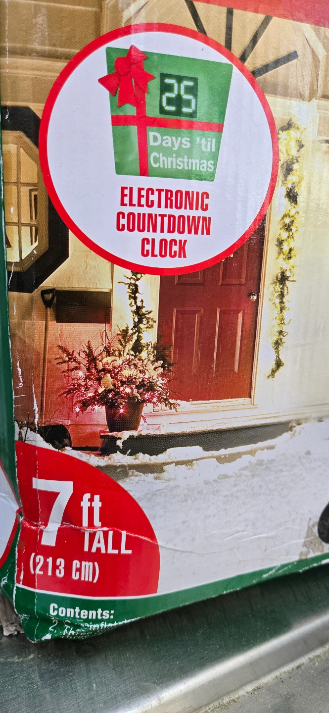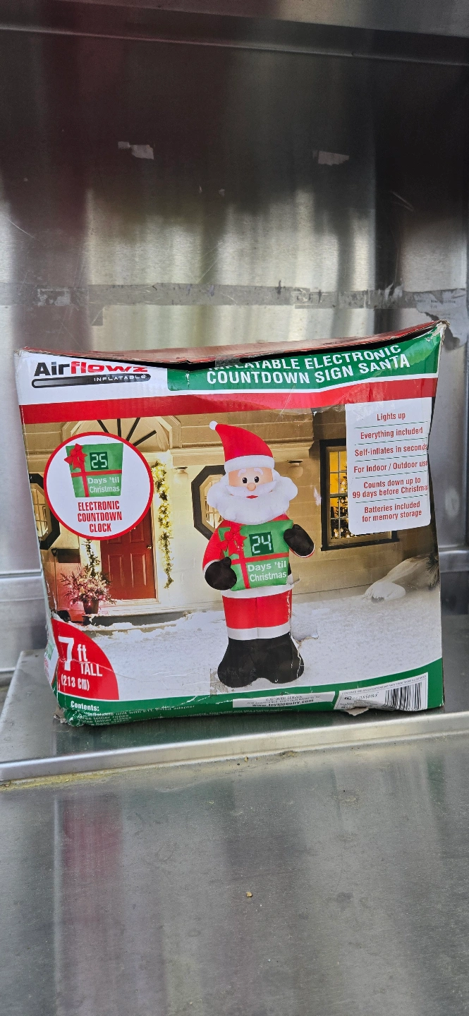 Inflatable Santa Claus. Electronic countdown clock. Self-inflates. Lights up. For indoor/outdoor use. 99 days before Christmas. Includes storage bag.