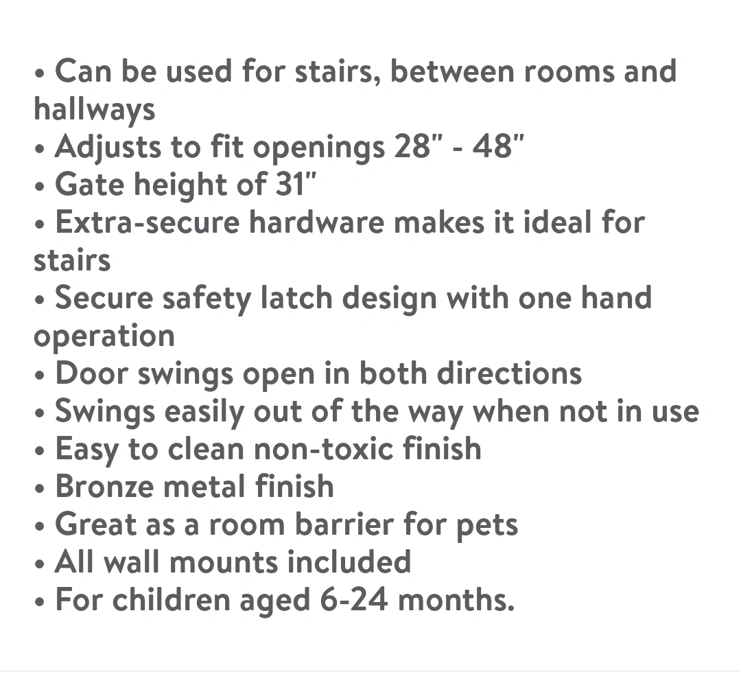 1000+Brand New Sealed Bily Expandable Metal Baby/Pet Gate Location: Scarborough Keep your baby or pet safe & secure in style! Features: ✔️ Expandable width: Fits 28" to 48" openings – perfect for doorways, hallways & stairs! ✔️ Sturdy metal frame with a sleek bronze finish – strong & stylish! ✔️ One-hand release – easy for adults, tricky for little ones & pets! ✔️ Hardware-mounted for top-of-stairs safety ✔️ Ideal for both babies and pets Why You’ll Love It: Safe & secure Stylish design Easy to use Pickup in Scarborough – delivery available nearby for a small fee Message me if you're interested or have questions! First come, first served!