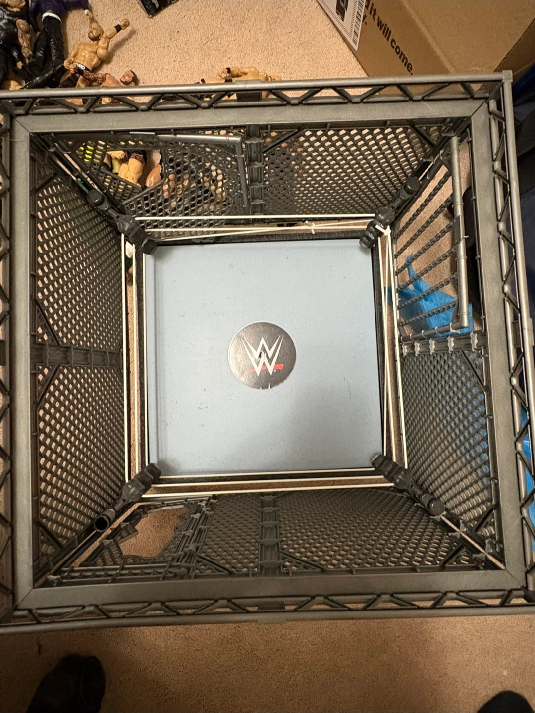 Also comes with a WWE Wrekkin Steel Cage ring. Ring also has some slight scratches from usage and being played with.