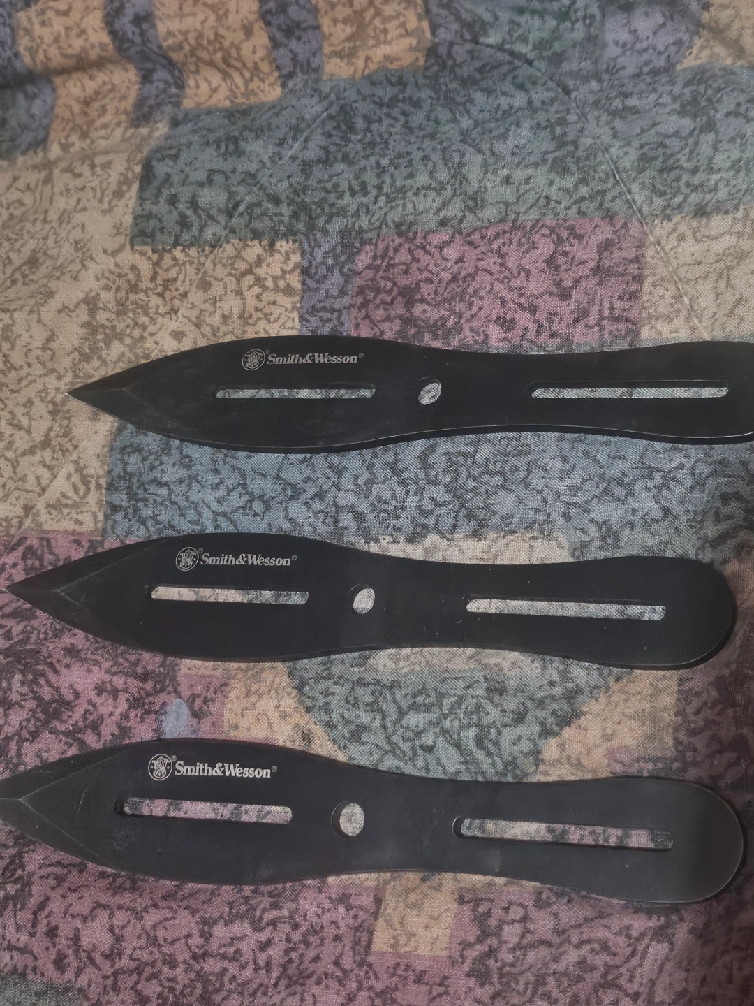 Three black Smith & Wesson throwing knives. Includes nylon sheath. Good condition. Perfect for target practice or collection.