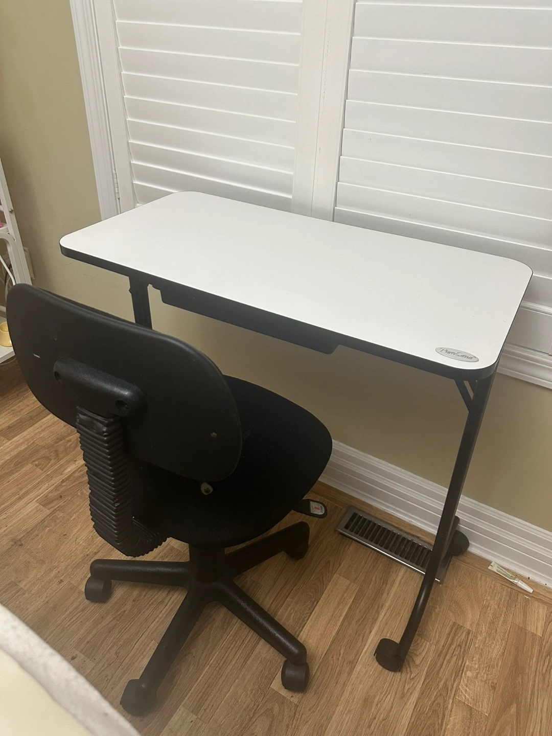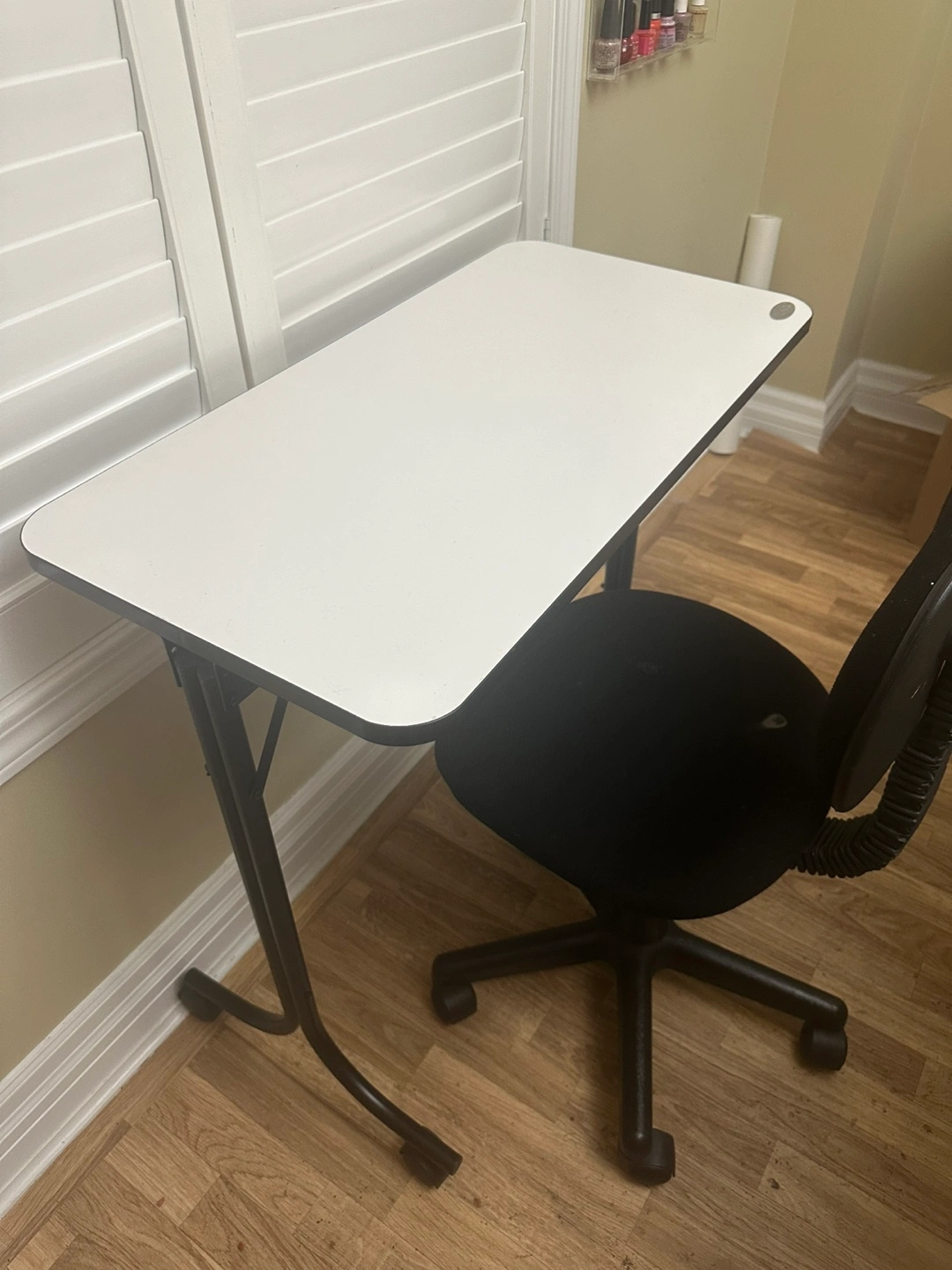 White foldable manicure table, black metal frame. Small, perfect for small spaces. Includes black rolling chair. Good condition.