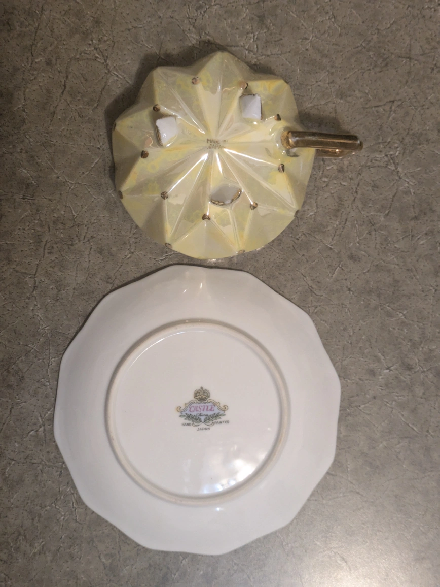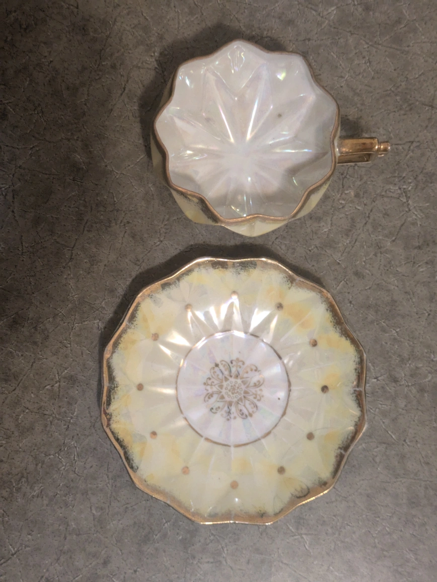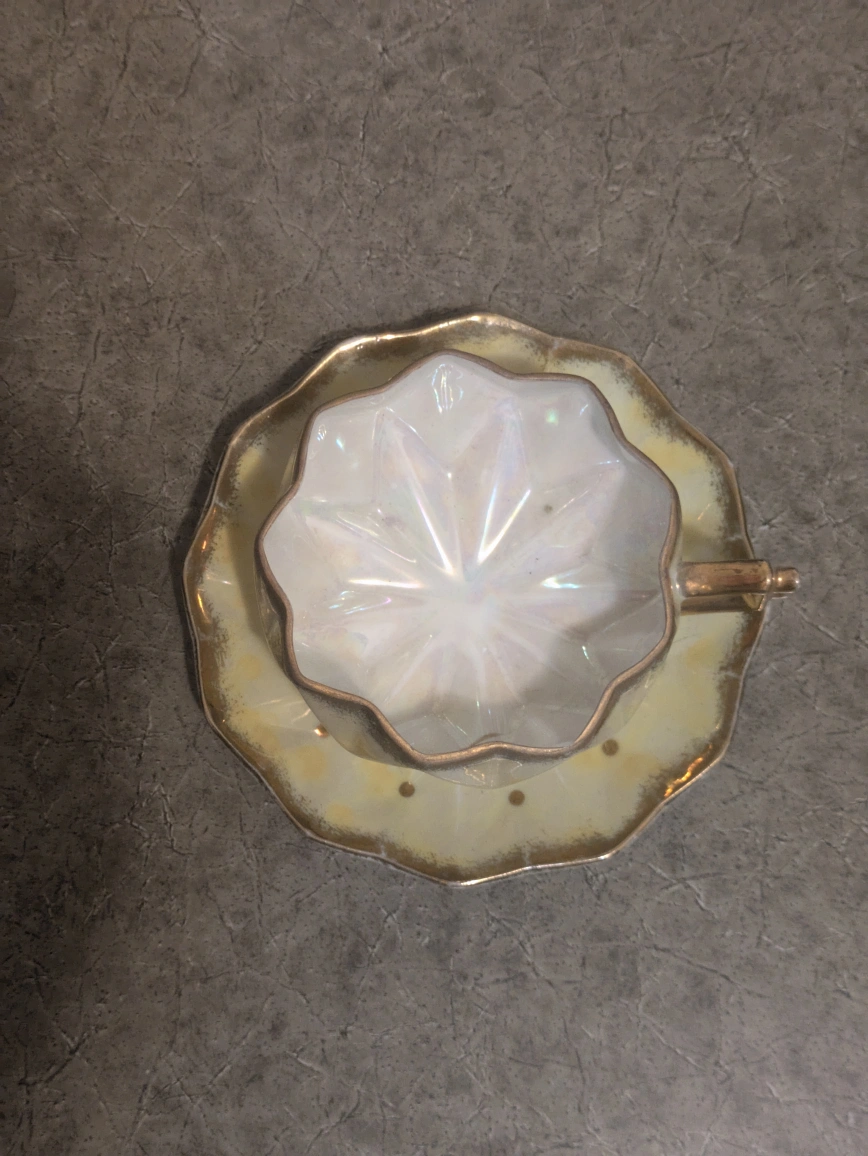 Pretty vintage teacup and saucer. Pale yellow colour. Gold detailing. Made in Japan.
