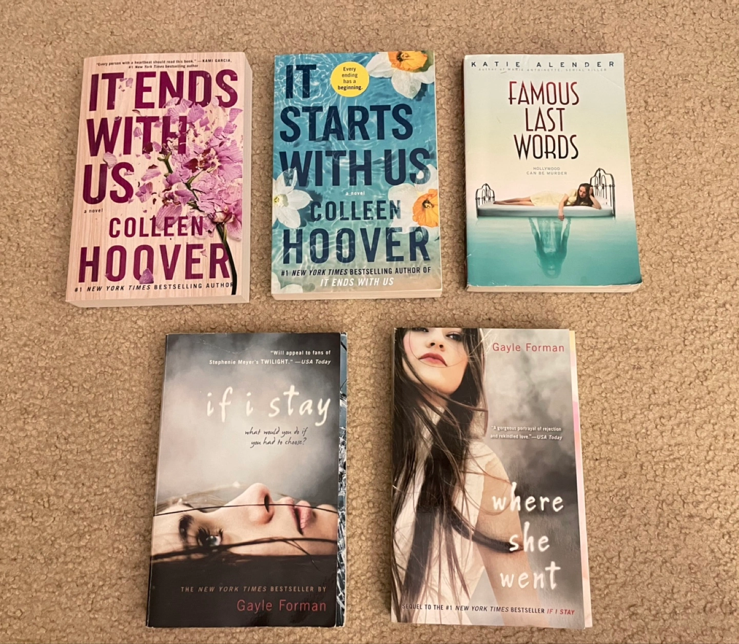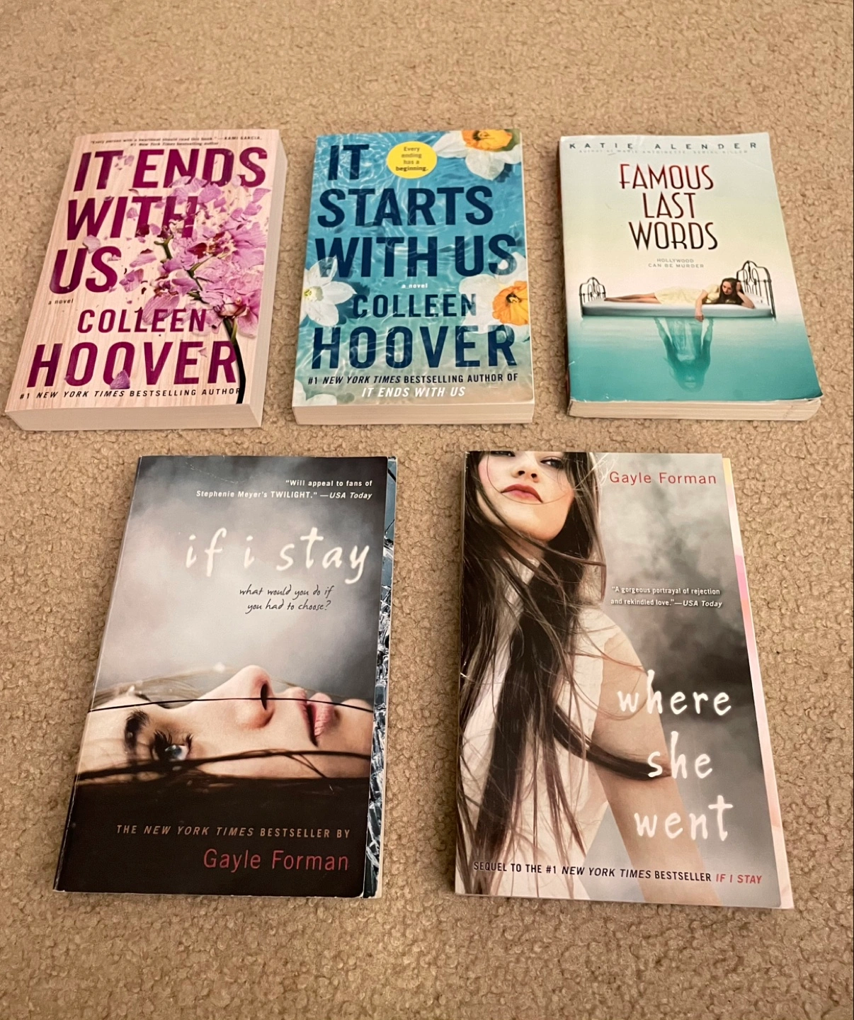 Five popular young adult novels. Titles include: It Ends With Us, It Starts With Us, Famous Last Words, If I Stay, and Where She Went. All for $5. All are in great condition one book has a couple bent marks but still good