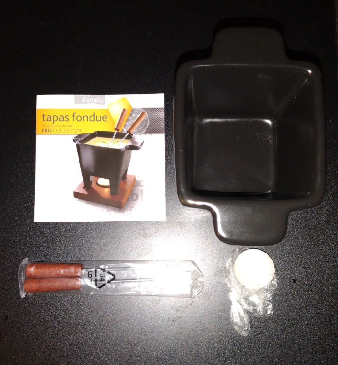 New Boska Tapas Fondue set. Includes ceramic pot, wooden base, two forks, and tea light. Microwave and dishwasher safe. Perfect for parties!
