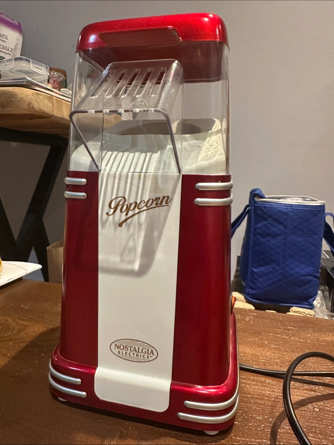 Retro-style popcorn machine. Red and white colour scheme. Features a clear lid. Makes delicious popcorn.