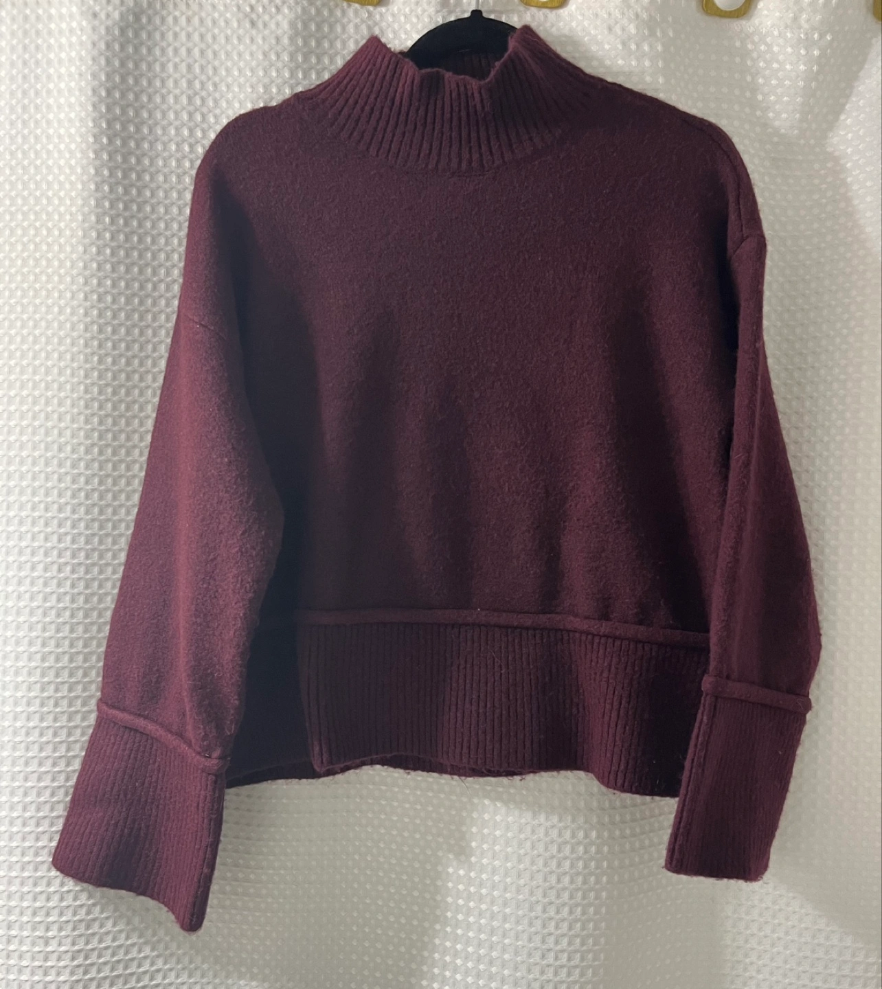 Burgundy mock neck sweater. Long sleeves, cropped length. Soft knit material. Excellent condition.