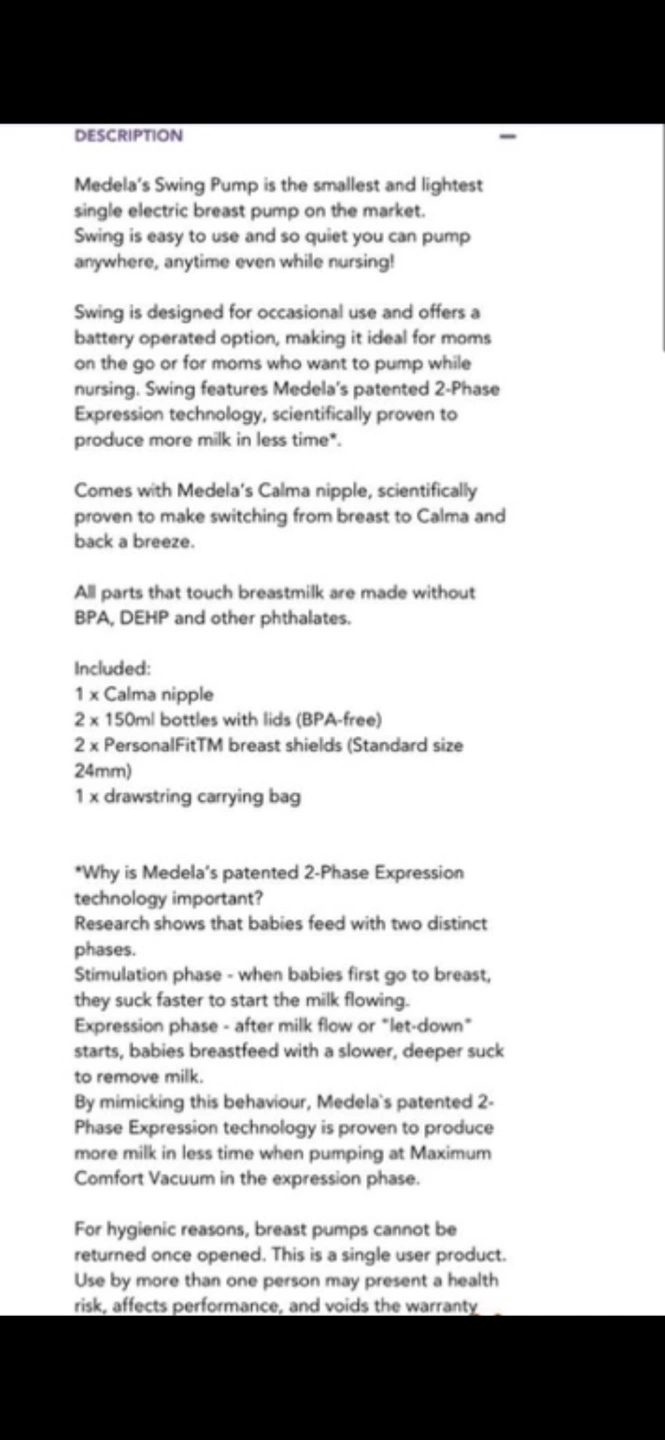 21Brand new- sealed in box Medela Swing single electric breast pump. Includes pump, bottles, and carrying bag. Excellent for expressing breast milk. Portable and easy to use. See the picture for the detailed description.