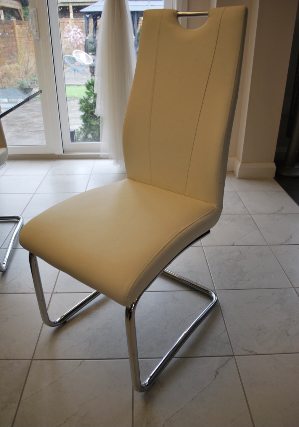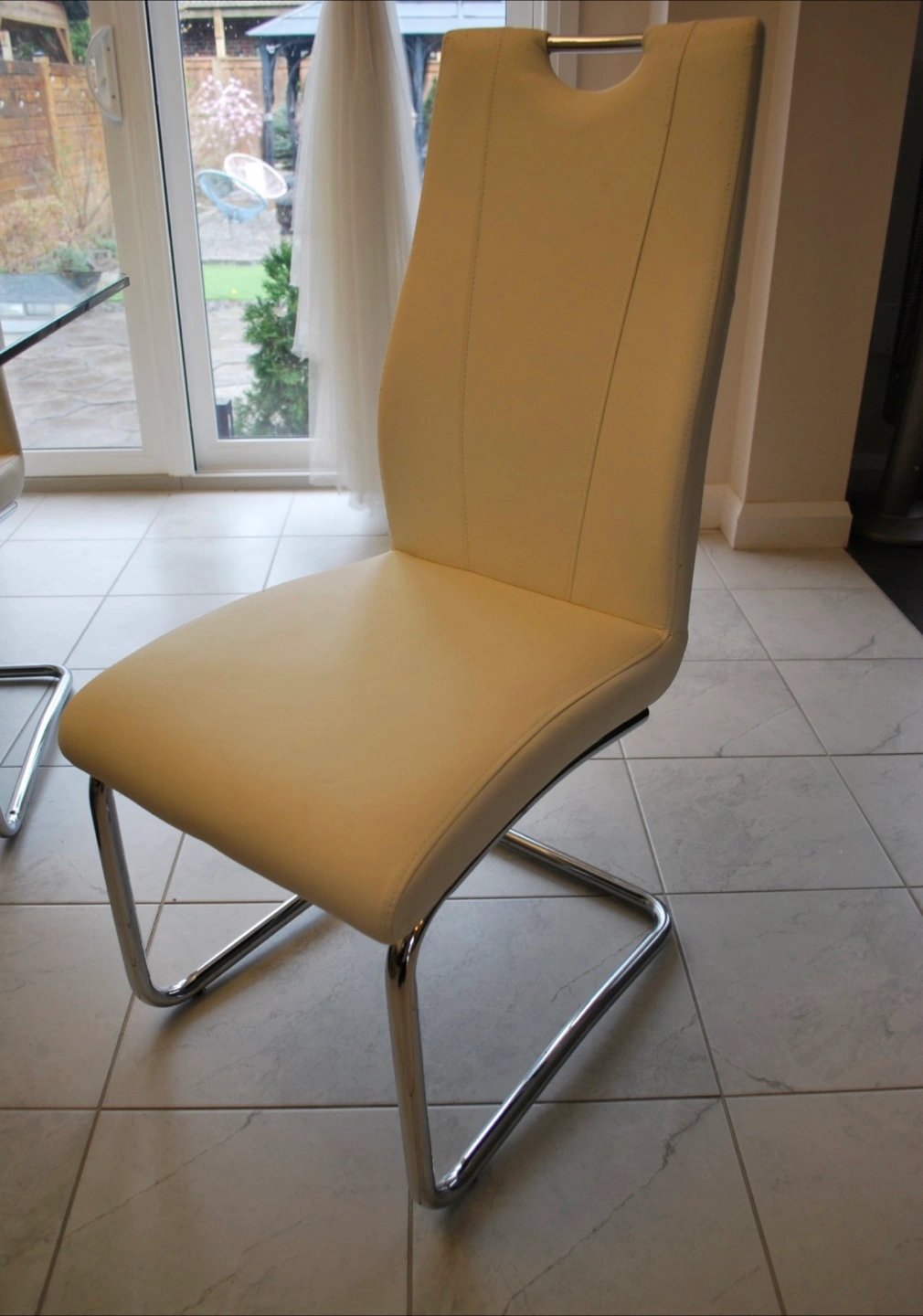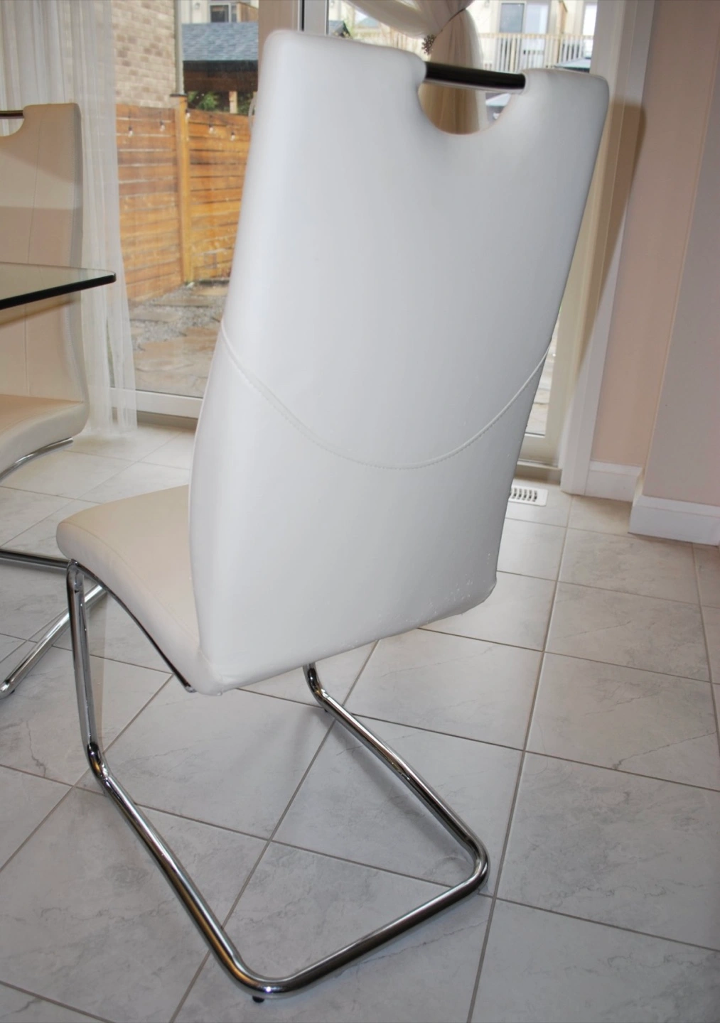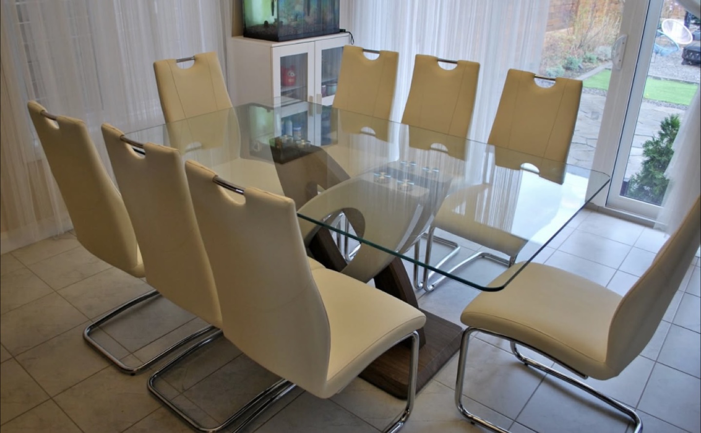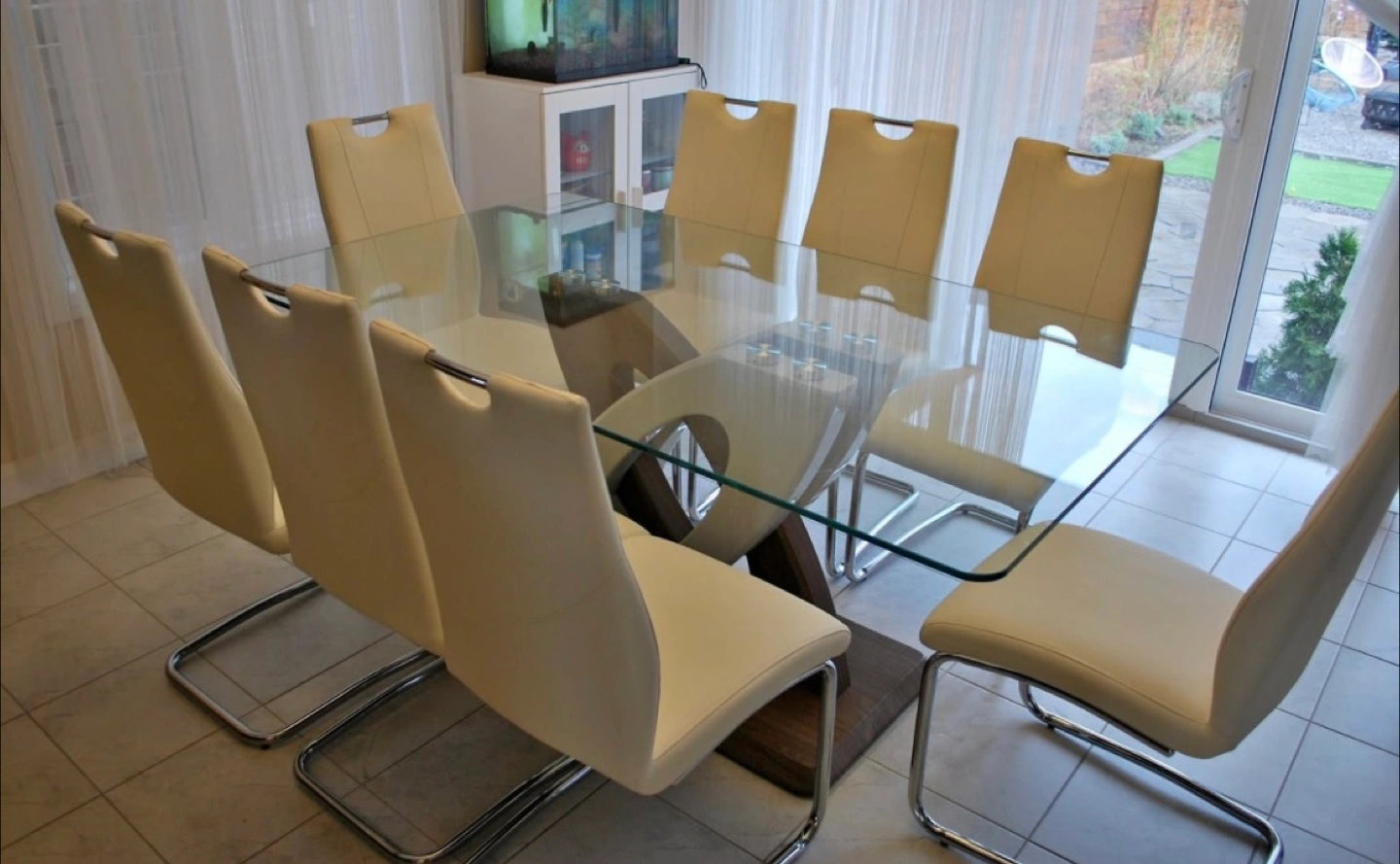 Modern Glass Dining Table with 8 Cream Leather Chairs
