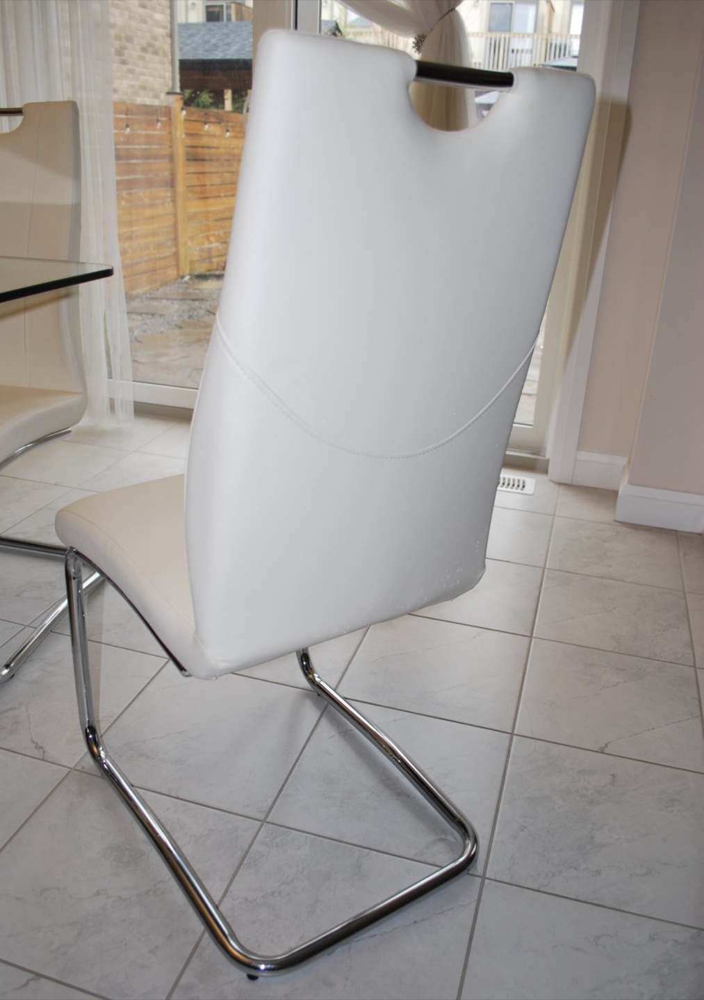 Glass-Top table with 8 off-white leather dining chairs. Chrome legs. Sleek glass top dining table. Walnut base. Contemporary design. Excellent for modern homes.